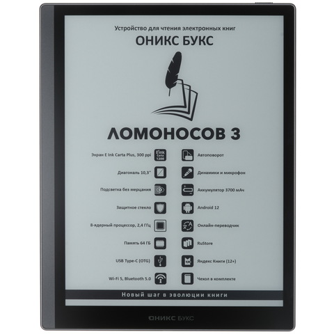 10.3" Электронная книга ОНИКС БУКС Ломоносов 3 черный + чехол [1860x2480, E-Ink Carta Plus, сенсор, подсветка, Wi-Fi, Bluetooth, 3700 мА*ч] - купить в Донецке ДНР