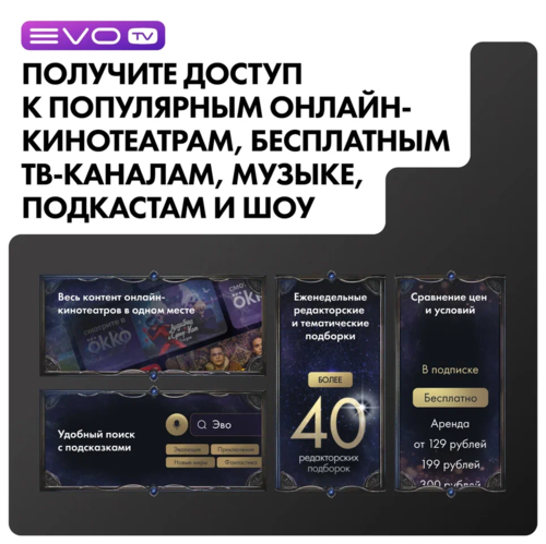 Телевизор EVO TV 50 с поддержкой Smart TV оснащен голосовым управлением через Google Assistant. Управлять им можно как с помощью кнопки на пульте, так и через мобильное приложение Evo. Аудиосистема мощностью 20 Вт обеспечивает чистый и объемный стереозвук благодаря встроенным технологиям. Устройство поддерживает функции видеозаписи и TimeShift для управления цифровым эфиром, а также Chromecast для беспроводной передачи контента с мобильных устройств на экран телевизора.