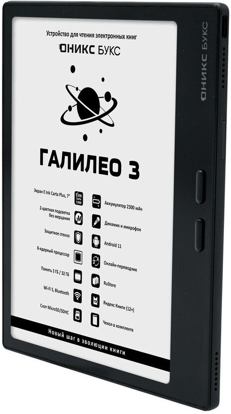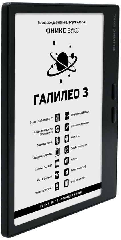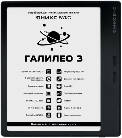 ОНИКС БУКС Галилео 3 представляет собой 7-дюймовый ридер с экраном E Ink Carta Plus (Carta 1300), оснащенным подсветкой и сенсорным управлением. Модель базируется на мощном 8-ядерном процессоре и имеет 3 ГБ оперативной памяти. Устройство работает под управлением Android 11, что позволяет устанавливать и использовать сторонние приложения через предустановленные магазины Google Play и RuStore.