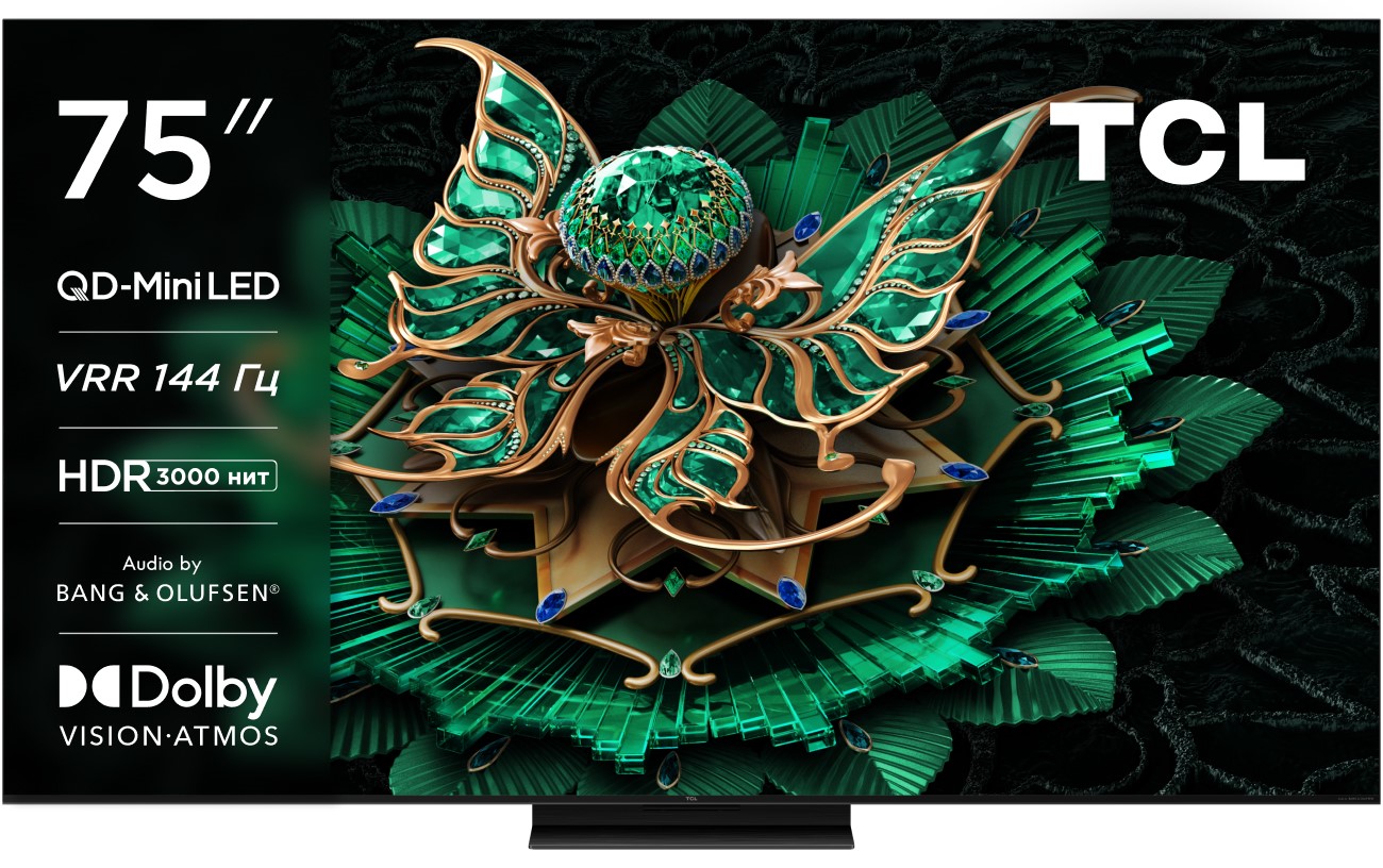 Телевизор TCL 75C7K – мощь игр и магия кино! Ультратонкий дизайн идеально дополнит ваш интерьер, а дисплей 75" 4К поразит реализмом благодаря технологии QD-Mini LED и пиковому свету 3000 нит. С технологией FreeSync Premium Pro играйте плавно и без разрывов, наслаждаясь частотой до 288 Гц! Звучание от Bang & Olufsen погрузит вас в мир эмоций всего одним касанием. Создайте идеальную картинку и звук вместе с TCL!