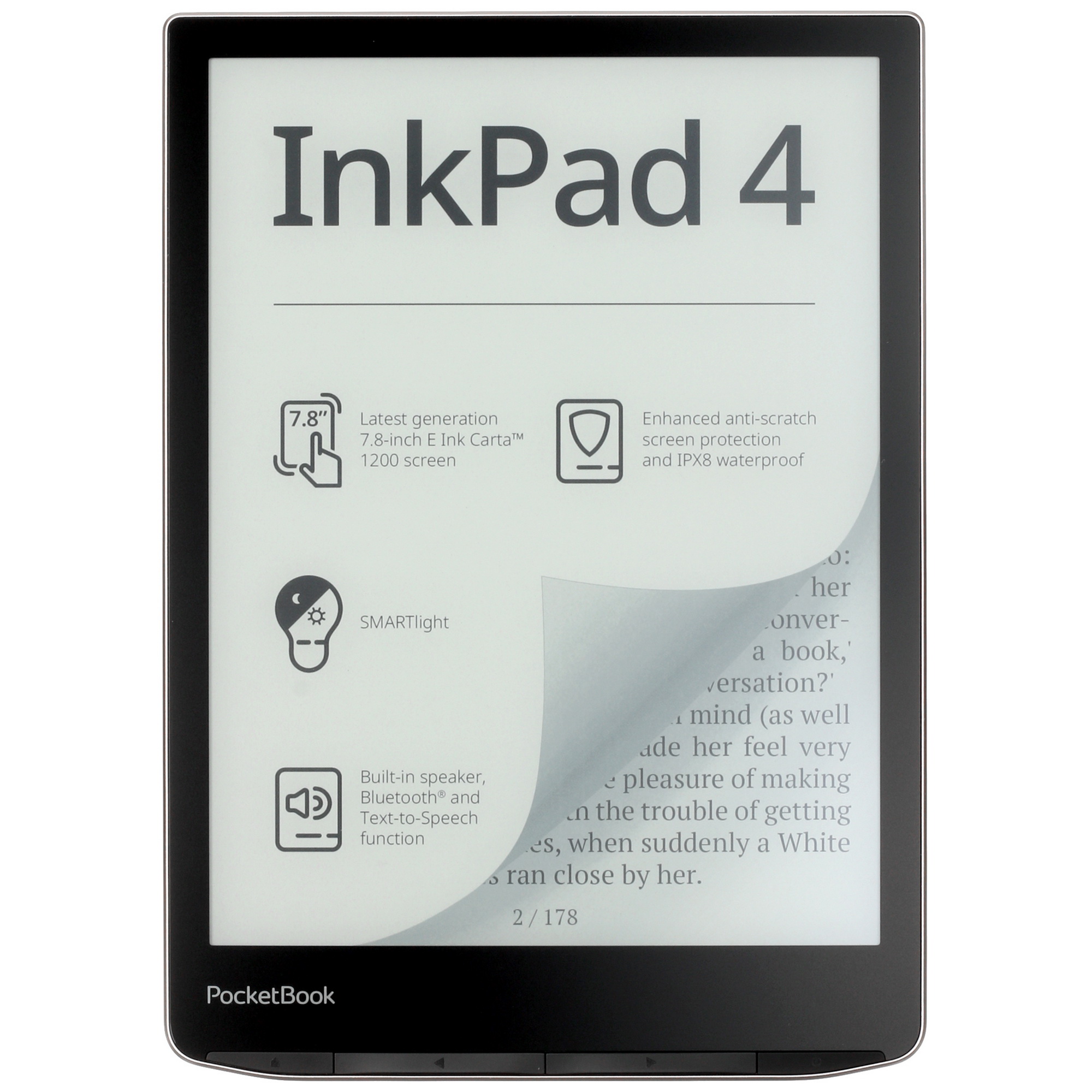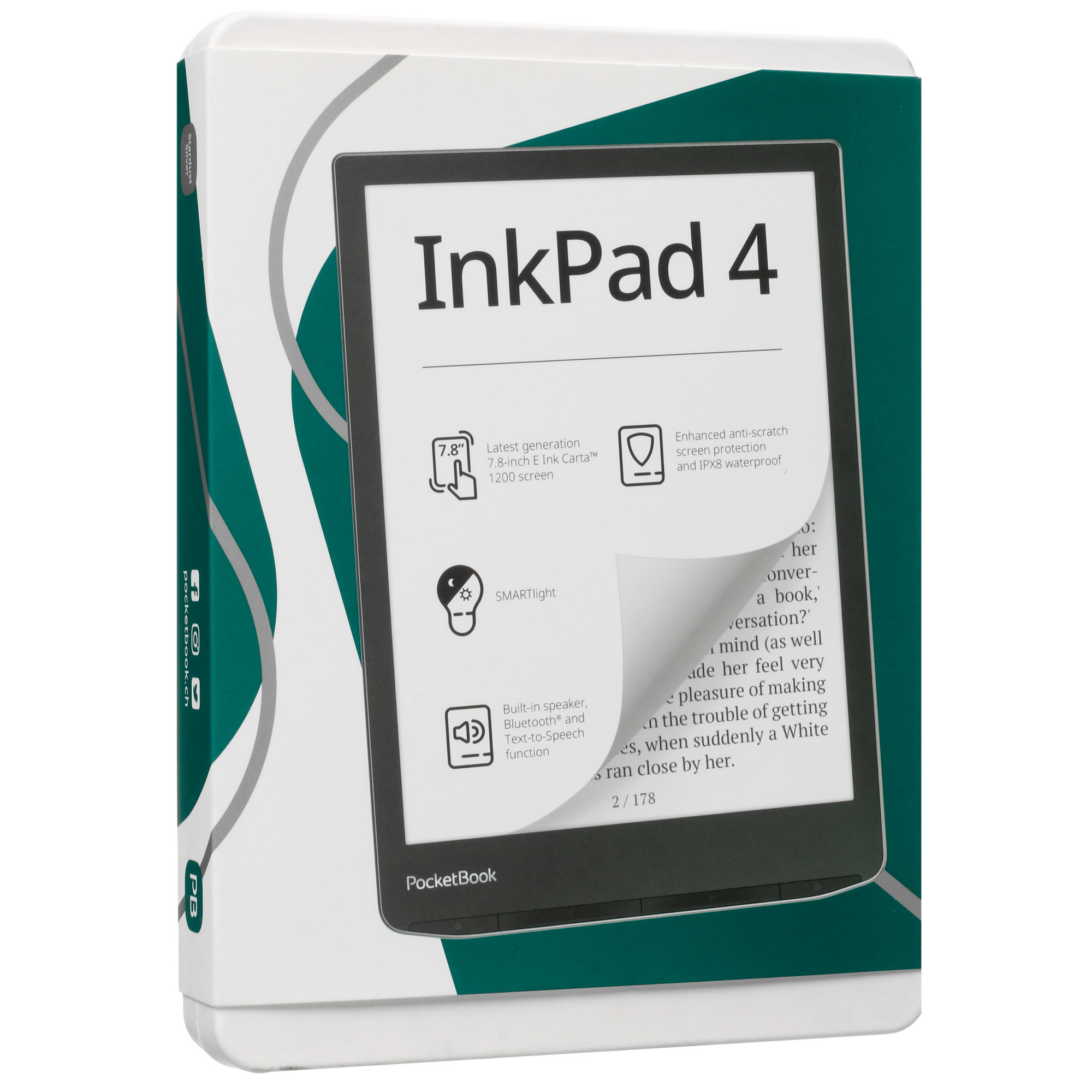 Электронная книга PocketBook InkPad 4, выполненная в элегантном тонком черном корпусе, надежно удерживается в руке независимо от положения. Сенсорный экран диагональю 7.8 дюймов обеспечивает четкую картинку и не утомляет глаза. Возможность регулировки цветовой температуры подсветки позволяет комфортно читать при любом освещении. 2-ядерный процессор с 1 ГБ оперативной памяти обеспечивает быструю и стабильную работу устройства.