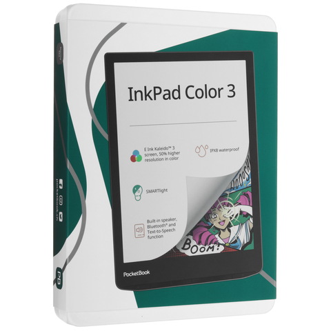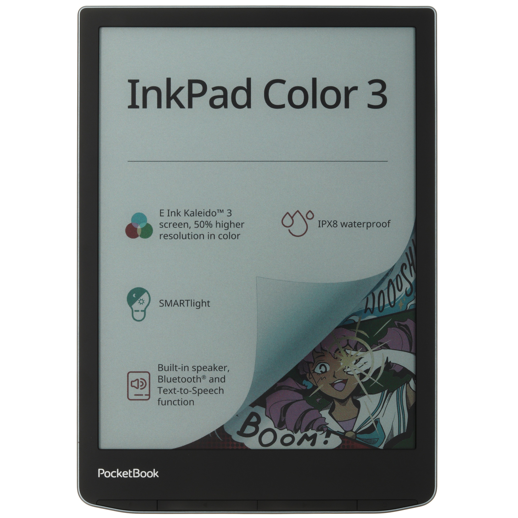 Электронная книга PocketBook InkPad Color 3 оборудована цветным сенсорным экраном E-Ink с диагональю 7.8 дюйма, который создаёт ощущение чтения с обычной бумажной страницы. Это снижает нагрузку на глаза при длительном использовании. Для удобства чтения можно настроить цветовую температуру подсветки, а также есть специальный режим для чтения в темноте, который предотвращает ослепление. Помимо сенсорного управления, устройство оснащено удобными физическими кнопками.