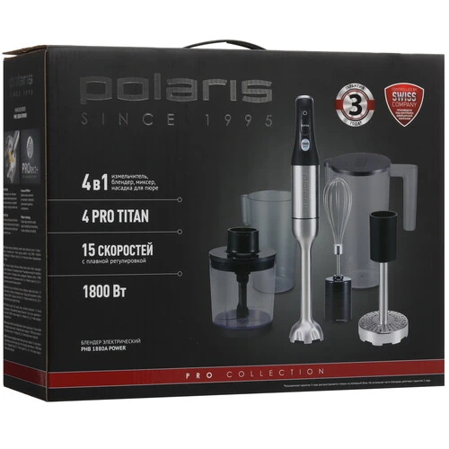 Погружной блендер Polaris PHB 1880A POWER – компактный и многофункциональный прибор, который позволит решить даже сложные кулинарные задачи. Выделяется высокой мощностью 1800 Вт и комплектацией 4 в 1: блендер, измельчитель, миксер и насадка для пюре. Также в наборе 2 вместительных мерных стакана 1,0 л с защитной крышкой и 0,6 л. Чаша измельчителя объемом 0,5 л, насадка для пюре со стальными лезвиями. 4-лепестковый нож блендера 4 PRO TITAN с титановым покрытием сохранит остроту и прочность на долгие годы. Для эффективной работы предусмотрено 15 скоростей с плавной регулировкой и режим Турбо, которые помогут добиться необходимой консистенции. Для защиты двигателя от перегрузки и перегрева предусмотрена технология PROtect+. Она продлевает срок службы двигателя и предотвращает его выход из строя. Блендером удобно пользоваться, он легко моется и не впитывает запахи. В комплект входит мешок для удобного хранения прибора и всех насадок. Гарантия 3 года.