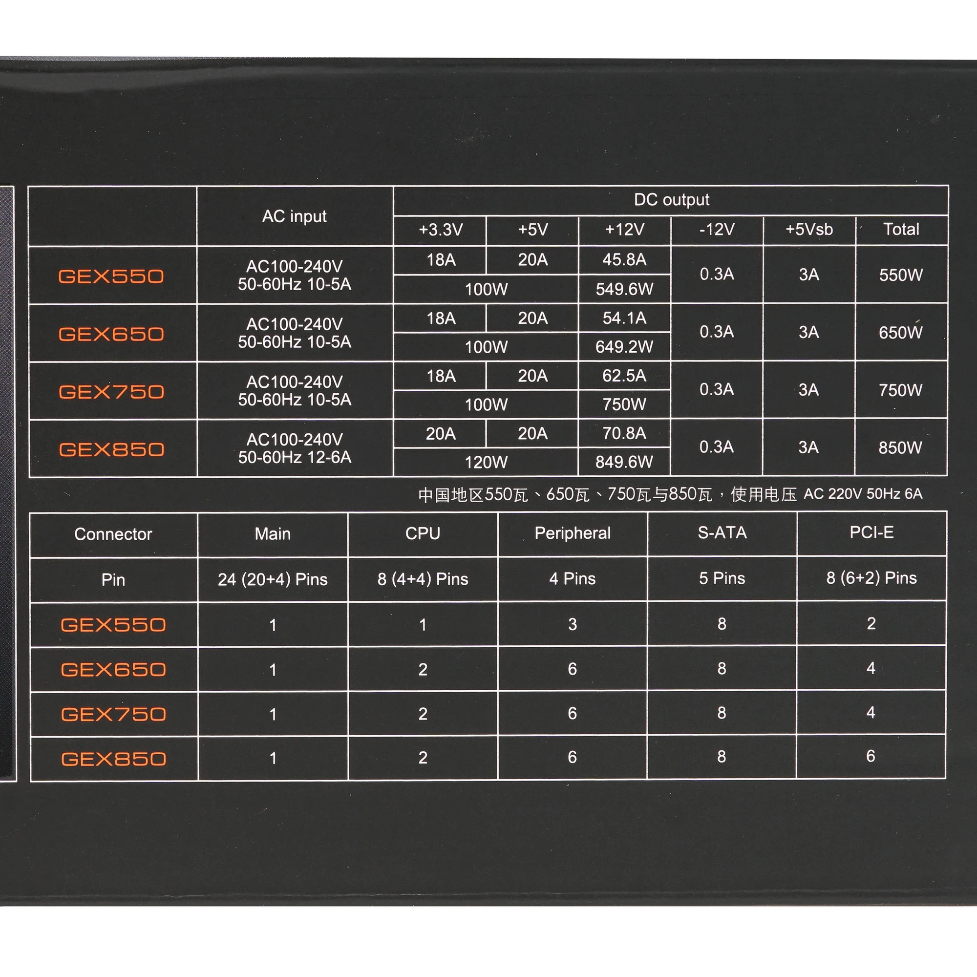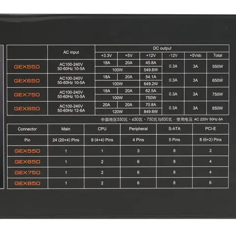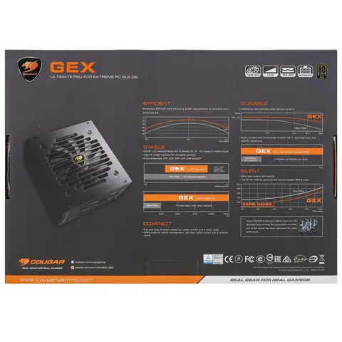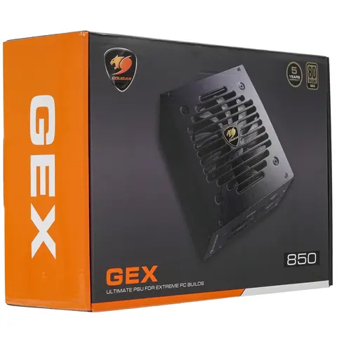 Cougar GEX850 имеет полностью модульный корпус ATX. Основное подключение выполняется через разъем (20+4)-pin. Процессор подключается через разъем (4+4)-pin, а видеокарты — через шесть разъемов (6+2)-pin. Также предусмотрено восемь разъемов 15-pin для накопителей SATA, что позволяет организовать вместительное хранилище. В комплект входят крепежные винты, кабели и держатели.