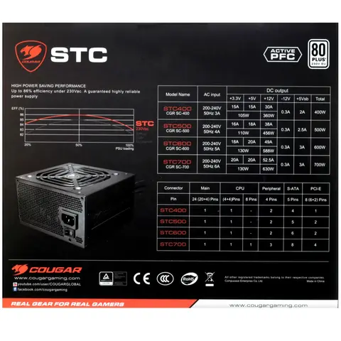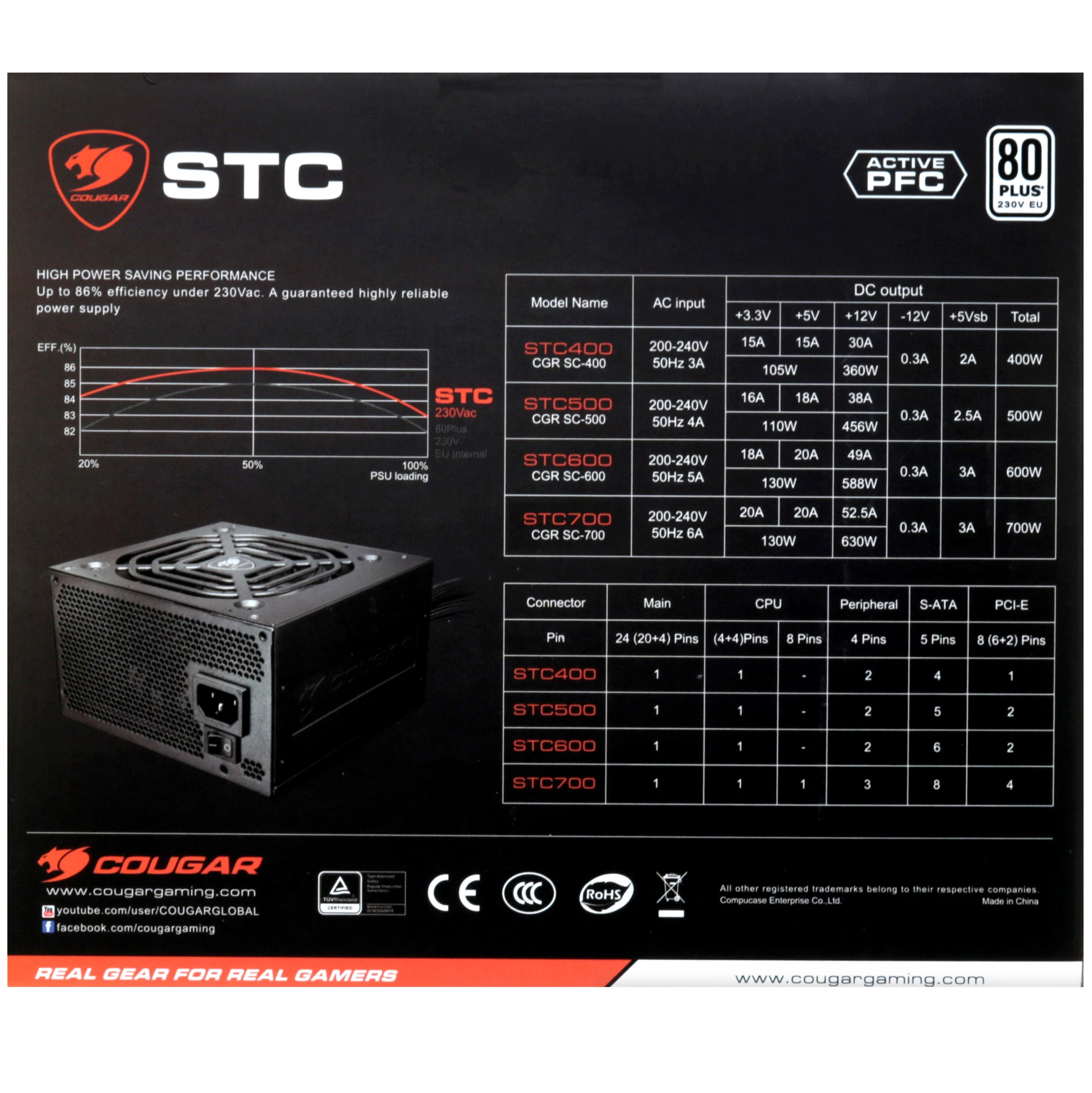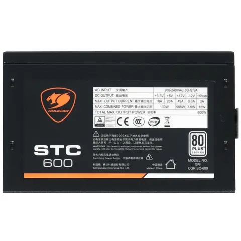 Cougar STC 600 оснащен всеми необходимыми разъемами для подключения винчестера, материнской платы, видеокарты и других компонентов. Кабели достаточной длины для удобного размещения внутри системного блока. Устройство оснащено японскими конденсаторами, которые отличаются долговечностью и низким уровнем шума. Для охлаждения используется активный вентилятор размером 120 мм, что обеспечивает эффективное охлаждение системы.