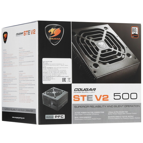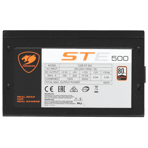 Полная выходная мощность Cougar STE 500W V2 составляет 500 Вт по всем линиям. Встроенный воздушный кулер размером 120x120 мм эффективно охлаждает модуль во время работы. Вентилятор с автоматической регулировкой скорости вращается до 1800 об/мин. Блок питания стабильно работает при входном напряжении 200-240 В и частоте тока 50-60 Гц.