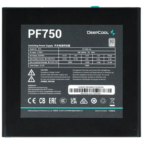 DEEPCOOL PF750 соответствует форм-фактору ATX и имеет сертификат 80 PLUS Standart, подтверждающий высокую энергоэффективность. Для эффективного охлаждения под нагрузкой блок оснащен тихим 120x120 мм кулером. Скорость вращения вентилятора автоматически регулируется в зависимости от нагрузки.