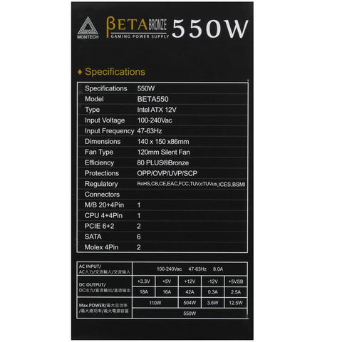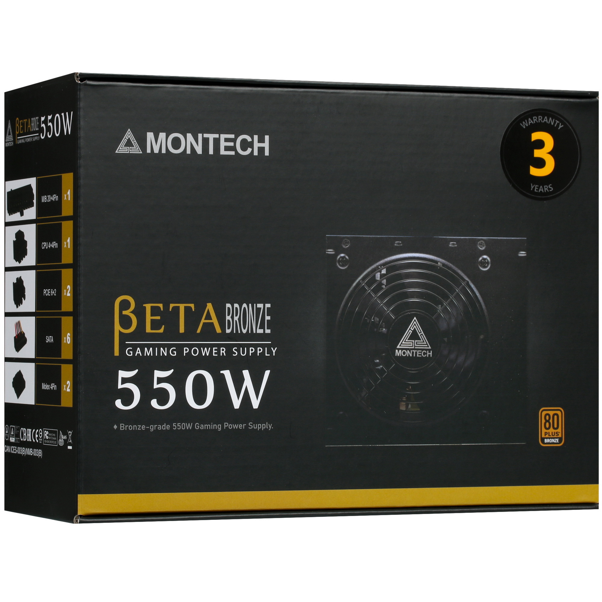 Блок питания MONTECH BETA 550 является отличным выбором для высокопроизводительных компьютерных систем. Он соответствует стандарту 80 PLUS Bronze и обладает мощностью 550 Вт, что гарантирует высокую энергоэффективность. Комплект включает в себя разъемы питания 20 + 4 pin и 4+4 pin, два разъема для видеокарт 6+2 pin, шесть SATA-разъемов и два Molex. Кабели имеют достаточную длину и оснащены защитной оплеткой, что упрощает их использование.
