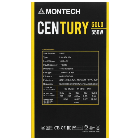 В MONTECH CENTURY 550 предусмотрена активная система охлаждения с 120-мм вентилятором. Скорость его вращения регулируется автоматически, а долговечный подшипник гарантирует надежность работы.