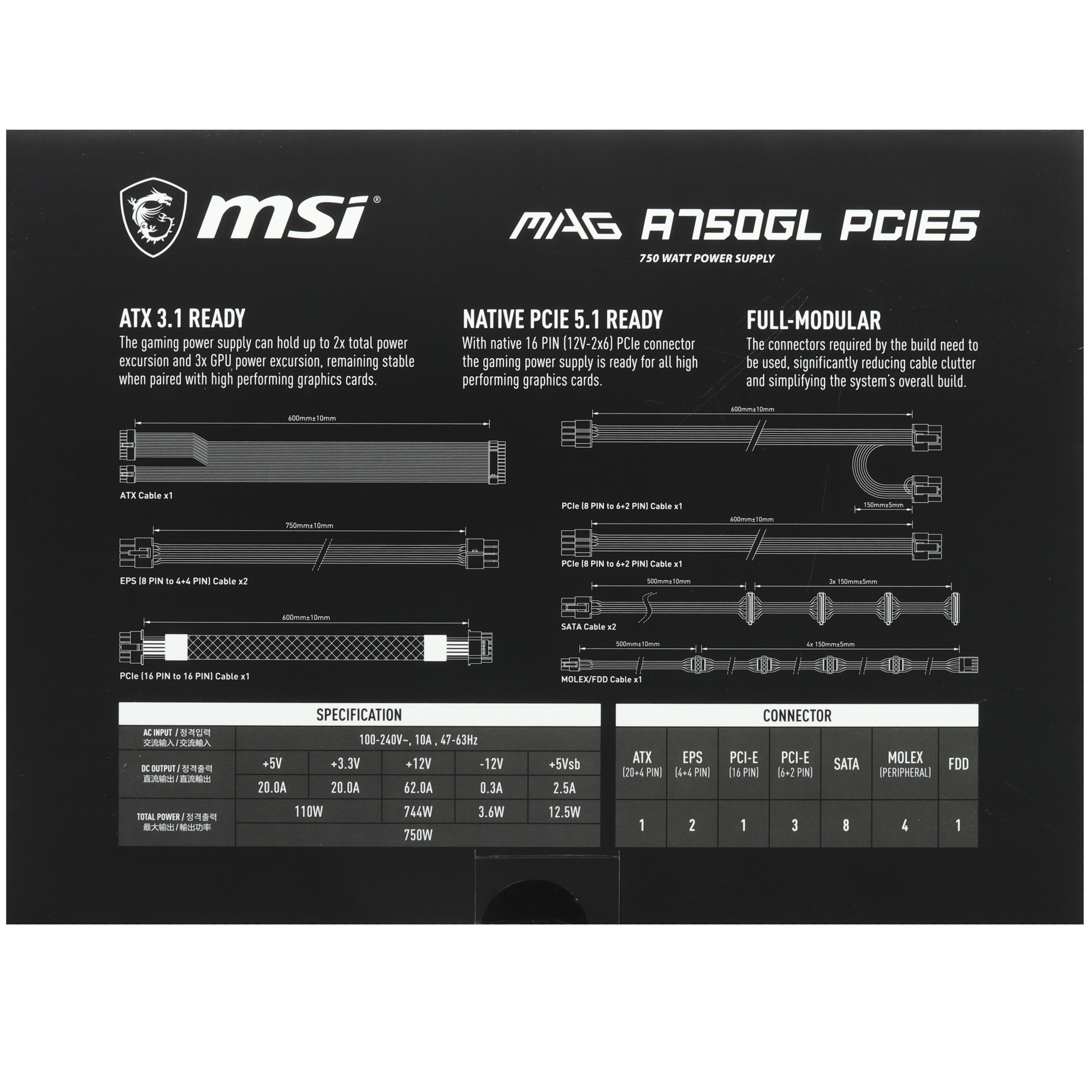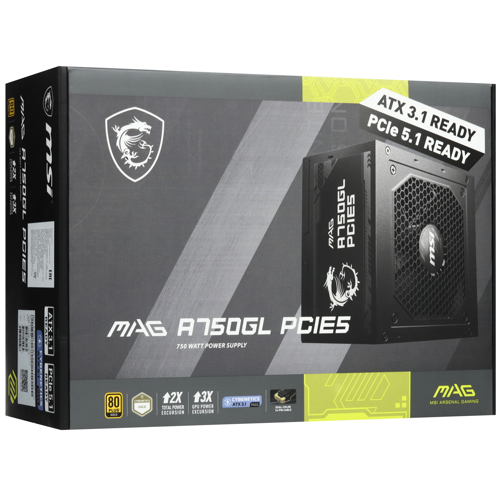 Откройте для себя блок питания MSI MAG A750GL PCIe5! Мощность 750 Вт удовлетворит даже самые ресурсоемкие сборки. Модульная система с отсоединяемыми проводами упрощает монтаж и освобождает пространство внутри корпуса. Встроенные защиты от перепадов напряжения, коротких замыканий и перегрева обеспечивают надежность и безопасность вашей системы. Новое слово в эффективности и удобстве — ваш компьютер будет работать безукоризненно!