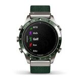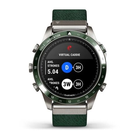 Garmin MARQ Golfer — это роскошные современные часы-инструмент с нейлоновым ремешком из жаккарда цвета Tritone Green. Они оснащены потрясающим сенсорным дисплеем AMOLED, традиционными кнопками управления и сверхпрочным корпусом из титана Grade 5 диаметром 46 мм. Эти часы обеспечивают высокую производительность батареи, позволяя вам не отставать от тренировок. Перезаряжаемая литиевая батарея работает до 16 дней в режиме с использованием жестов и до 6 дней в постоянно включённом режиме.