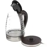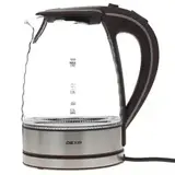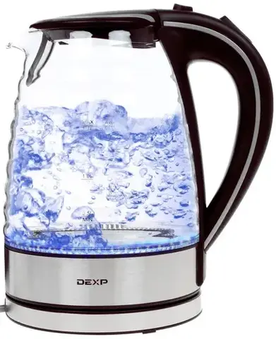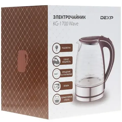 Электрочайник DEXP KG-1700 Wave отличает необычный дизайн резервуара для воды. Прозрачная стеклянная колба имеет волнистую форму, благодаря чему эта модель невольно приковывает к себе взгляды. Внешний вид устройства дополнен серебристой подставкой и коричневыми ручкой и крышкой. Рассчитанный на кипячение до 1.7 л воды прибор тратит на эту незамысловатую процедуру минимум времени за счет высокой мощности, равной 2200 Вт. Качественные материалы изготовления гарантируют превосходную работу техники без подтеканий на стыках и запаха пластика. Электрочайник DEXP KG-1700 Wave оснащен фильтром в носике, за счет которого в чашку с кипятком не попадут мелкие частички накипи и разнообразные взвеси. Благодаря скрытому типу нагревательного элемента прибор удобно очищать от накопившихся загрязнений не только снаружи, но и внутри. Благодаря мерной шкале вы сможете определить объем воды, оставшейся в чайнике, и при необходимости долить ее. Мягкая подсветка добавляет оригинальность во внешний вид представленной модели.