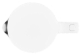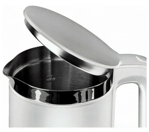 Чайник имеет форму красивого белого кувшина с блестящей стальной полосой и удобным носиком.