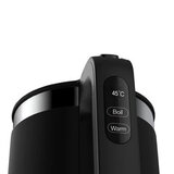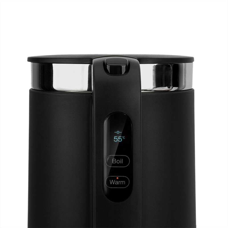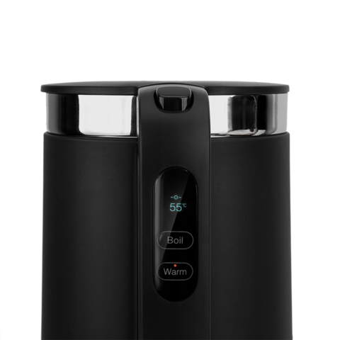 Этот чайник обладает функциями кипячения, подогрева воды до температуры от 50 до 100 °C и поддержания выбранного уровня температуры в течение 12 часов. Стильный черный корпус скрывает емкость на 1.5 литра, а скрытый ТЭН облегчает удаление накипи и других отложений, которые могут накапливаться со временем.