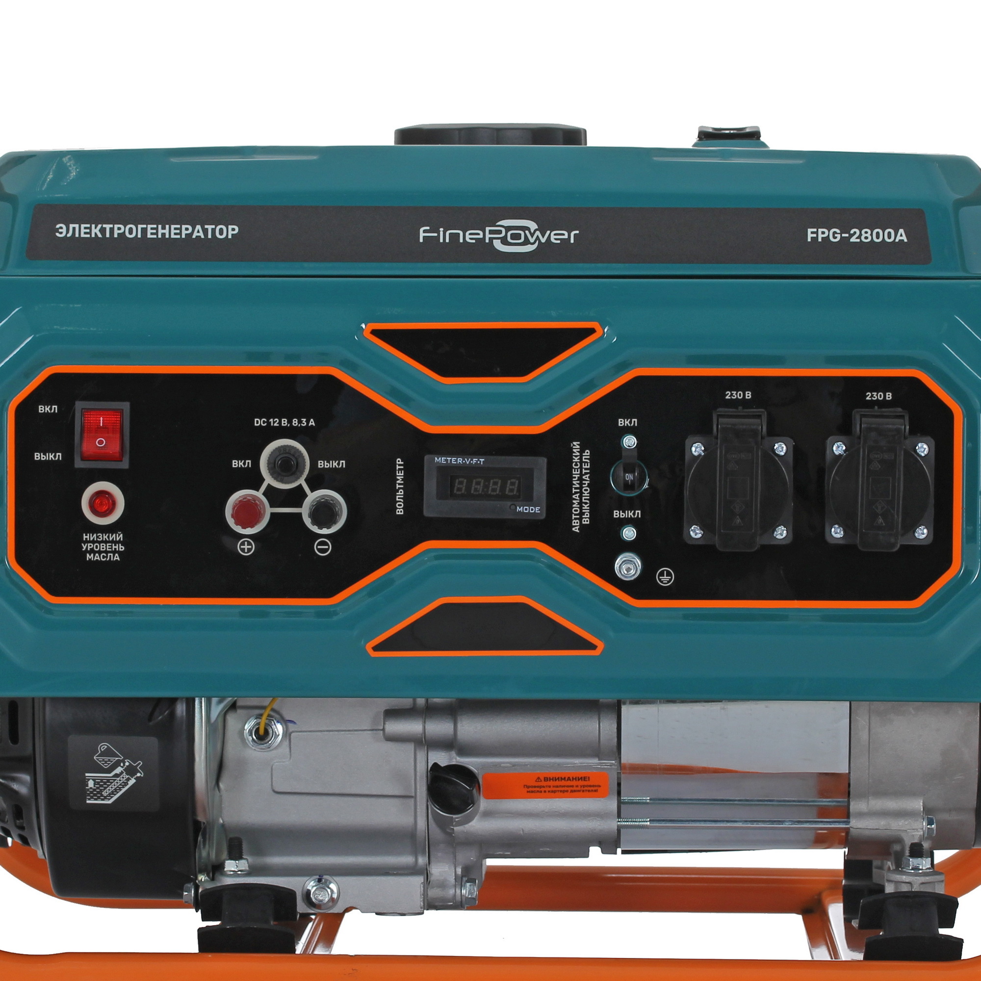 Электрогенератор FinePower FPG-2800A с мощностью 2.8 кВт служит надежным источником резервного питания для различного оборудования. Он оборудован двумя розетками, защищенными крышками, и выходом 12 В. При полном заполнении топливный бак объемом 15 литров обеспечивает до 7.5 часов работы генератора.