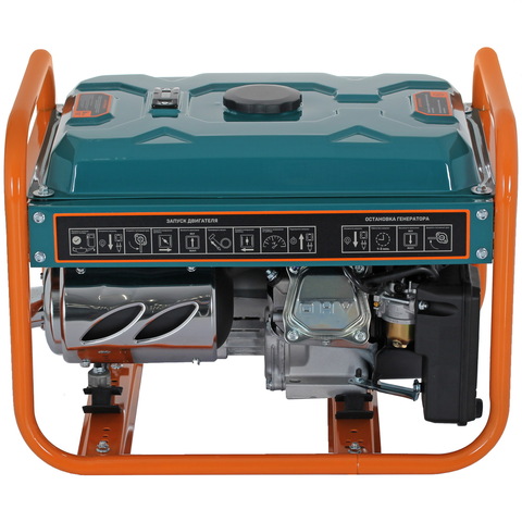 На панели управления установлен вольтметр, отображающий напряжение и силу тока. Металлические опоры генератора защищают внутренние компоненты от повреждений и обеспечивают устойчивость на разных поверхностях. Для удобства транспортировки предусмотрены ручки.