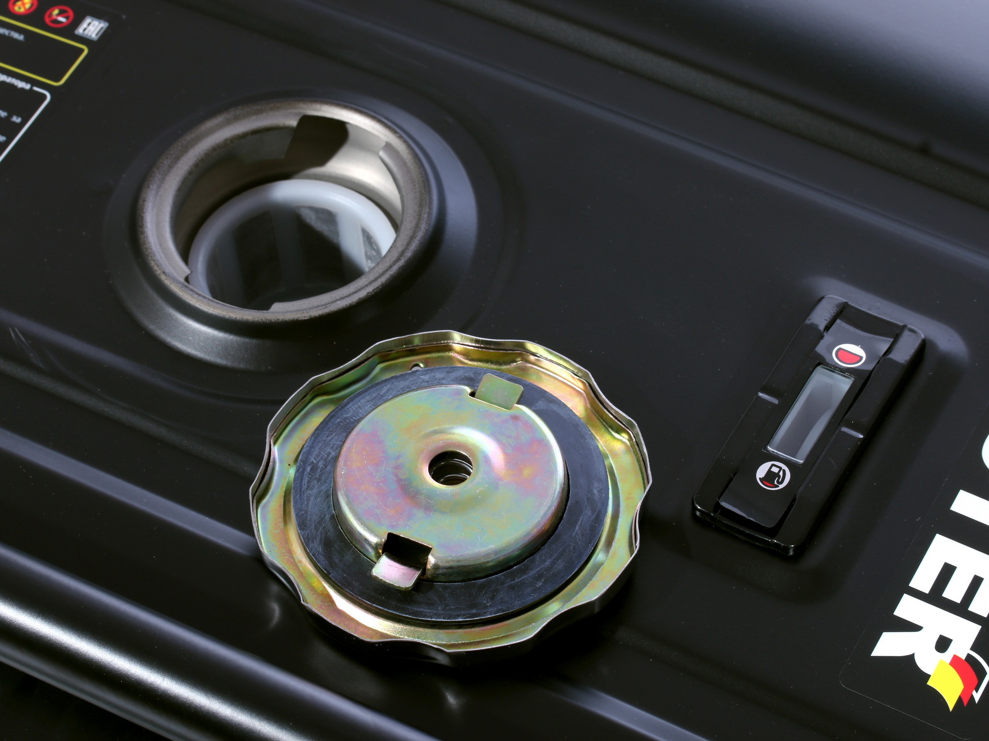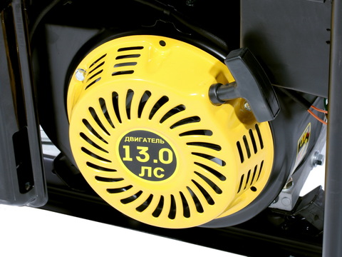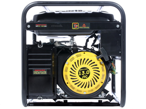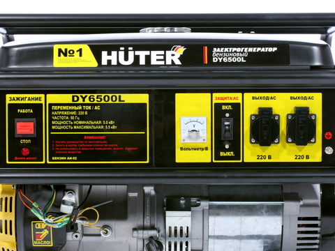 Генератор Huter DY6500L защищен трубчатой рамой, которая не только предохраняет оборудование от ударов и повреждений, но и служит удобной ручкой для переноски агрегата весом 84 кг силами двух человек. Четырехтактный двигатель мощностью 13 лошадиных сил, приводящий генератор в действие, эффективно работает на бензине марки АИ-92. На одном полном баке топлива (объемом 22 литра) генератор способен функционировать до 11 часов.