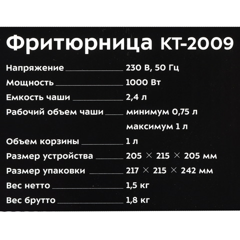 Kitfort KT-2009 позволяет плавно регулировать температуру, чтобы каждому блюду создать идеальные для доведения до готовности условия. Крышку можно полностью снять, как и ручку корзины. Корпус прибора изготовлен из нержавеющей стали, которой не страшна коррозия, поэтому фритюрница прослужит долгие годы.