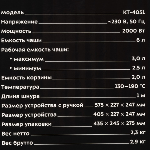 Фритюрница KITFORT КТ-4051 мощностью 2000 Вт имеет основную чашу со съемной конструкцией, которая упрощает очистку от загрязнений. Наличие холодной зоны исключает риск подгорания продуктов. Механическая панель управления позволяет регулировать температуру нагрева. Фритюрница KITFORT КТ-4051 оснащена нескользящими ножками для устойчивого положения на любой поверхности. Для компактного хранения сетевого шнура длиной 1 м предусмотрен специальный отсек. Температура нагрева может достигать значения 190 °C.