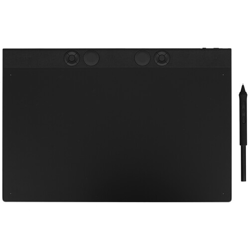 В комплект с графическим планшетом входит перо Wacom Pro Pen 2, которое поддерживает 8192 уровня нажатия и имеет точность 0.4 мм. Это позволяет регулировать толщину и прозрачность линий. Перо оснащено двумя переключателями под первой фалангой пальца. В наборе также есть 10 сменных наконечников для пера. Слева на планшете расположены восемь аппаратных клавиш Express Key и кольцо Touch Ring. Эти кнопки можно запрограммировать на выполнение горячих команд, таких как смена кисти, масштабирование, сохранение файла и отмена действия. Кольцо Touch Ring позволяет изменять размер кисти или яркость штриха.