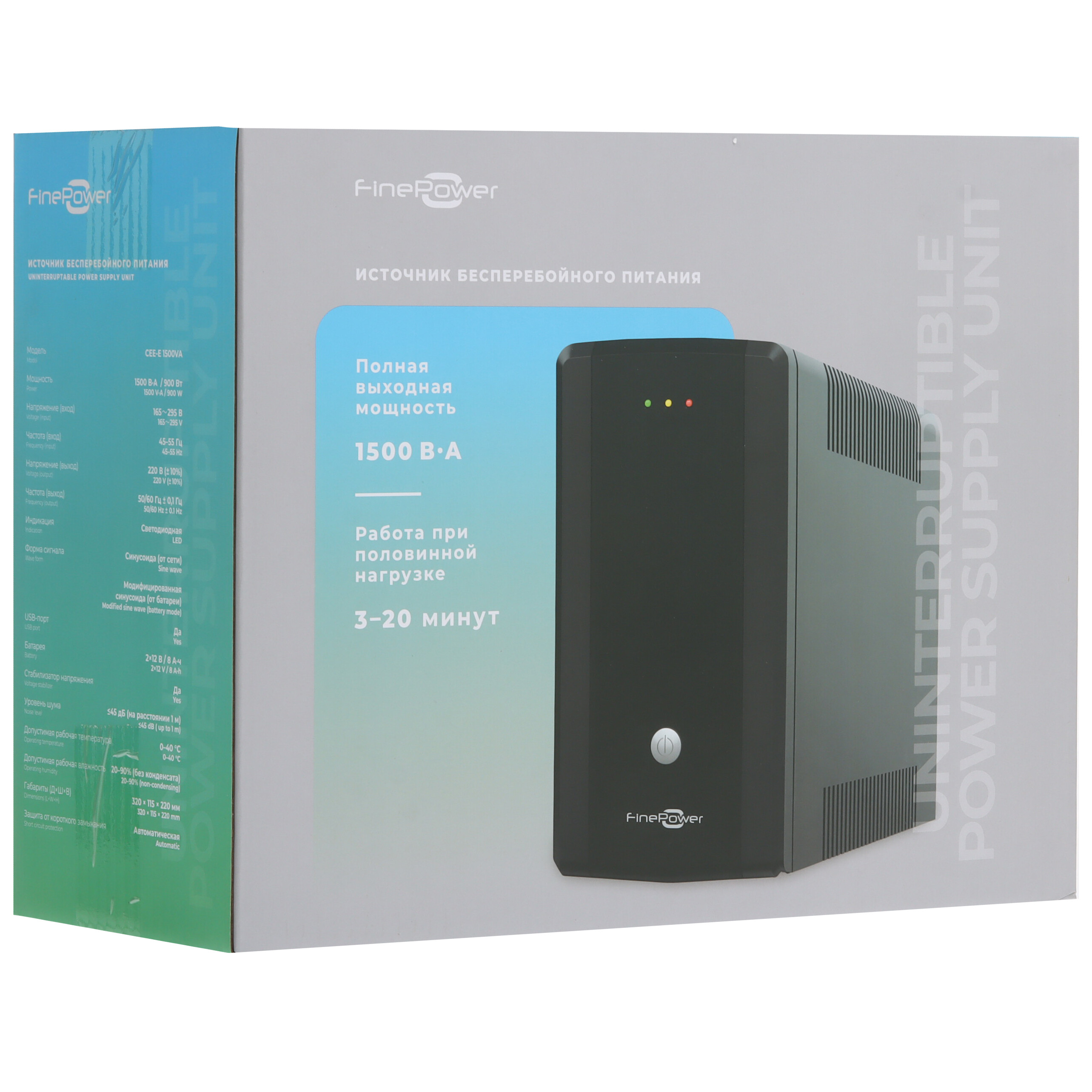 Линейно-интерактивный источник бесперебойного питания (ИБП) FinePower CEE-E 1500VA с выходной мощностью 900 Вт обеспечивает резервное питание для компьютеров, сетевого оборудования и других устройств. К нему подключены четыре евророзетки с защитными шторками и заземлением. Модифицированная синусоида на выходе совместима с любыми устройствами, оснащенными импульсными блоками питания, а также с большинством бытовых приборов. В конструкции предусмотрены три уровня защиты: от высоковольтных импульсов, короткого замыкания и перегрузки, а также фильтрация входного напряжения. Резервное питание с суммарной мощностью до 900 Вт может поддерживаться в течение 5 минут.
