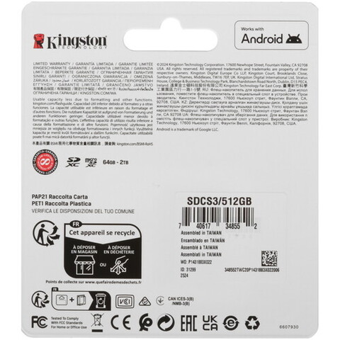 Карта памяти Kingston microSDXC объёмом 512 ГБ (SDCS3/512GB) соответствует классам скорости A1, UHS Class 3 и Video Class 30. Она предназначена для использования в смартфонах, фотокамерах и других электронных устройствах.