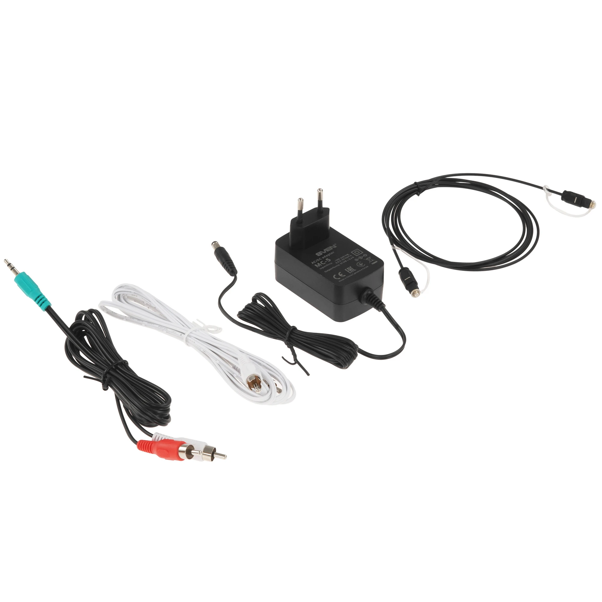 блок питания, документация, кабель 2RCA-2RCA, кабель 2RCA-3.5 jack, оптический кабель, пульт ДУ