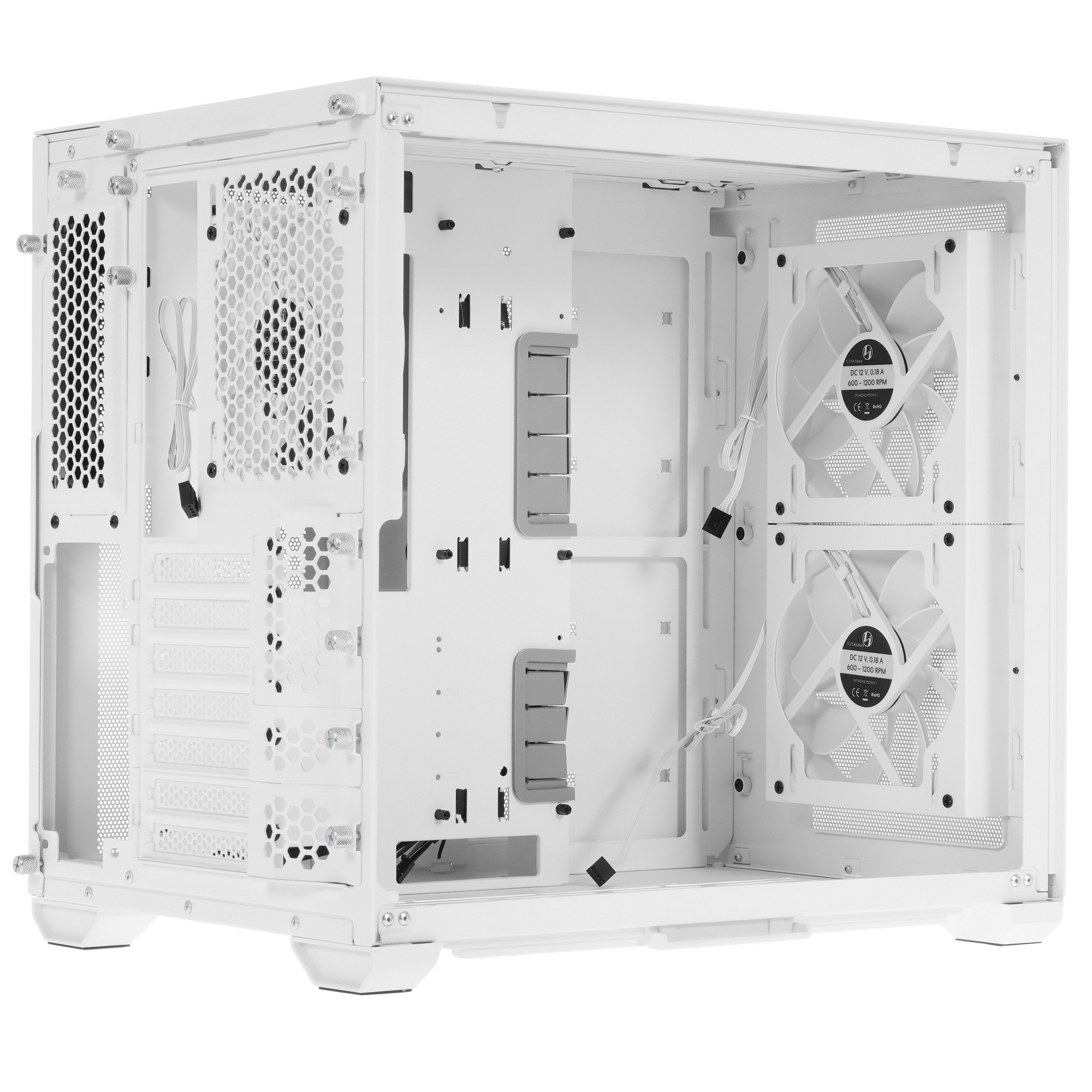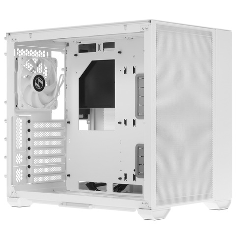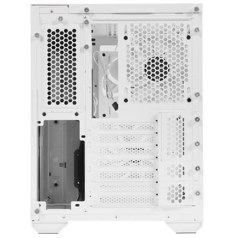 Корпус LIAN LI PC-O11 Mini Air [G99.O11AMW.R0] на ножках соответствует форм-фактору Mid-Tower. Это означает, что он занимает минимум пространства на рабочем столе или под ним, при этом предоставляя возможность установить внутри множество офисных или игровых компонентов. Корпус отличается оригинальным дизайном: он выполнен в белом цвете, а лицевая панель представляет собой металлическую сетку. Основной материал корпуса — сталь, пластик и стекло. Боковые панели крепятся к задней части с помощью винтов.