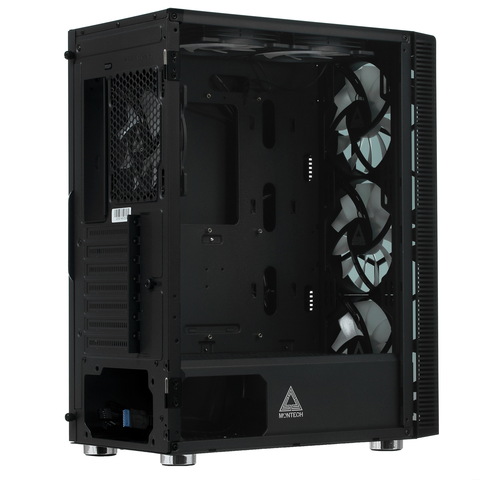 Вентиляторы корпуса MONTECH X3 GLASS оснащены многоцветной подсветкой, управление которой осуществляется с помощью кнопки на корпусе. Боковые панели открываются на петлях, как дверцы.