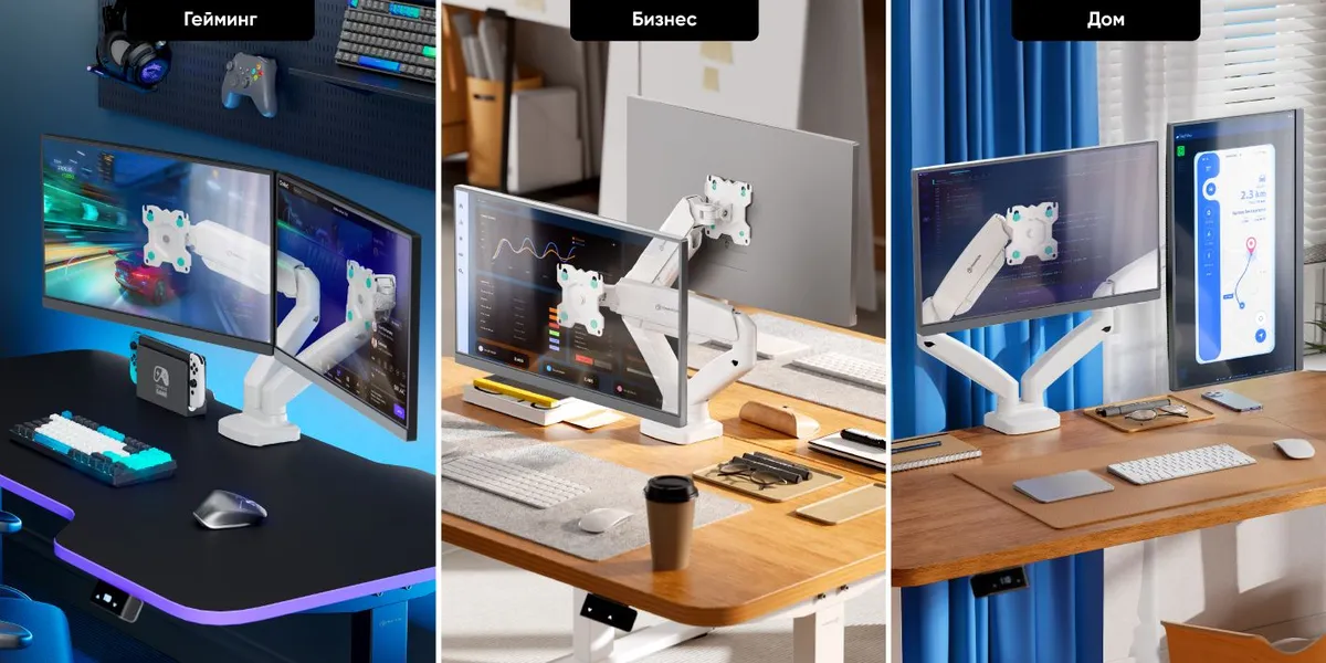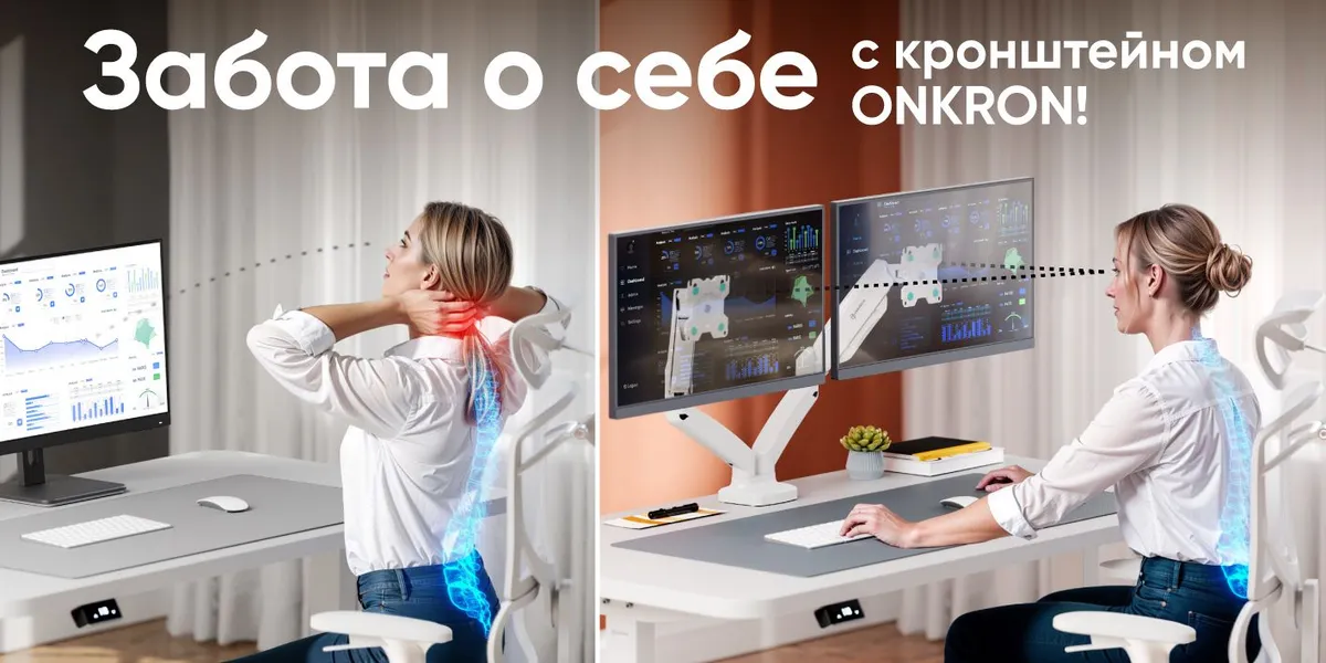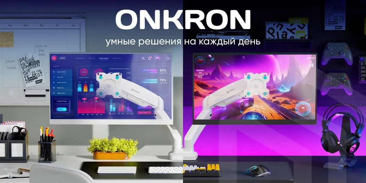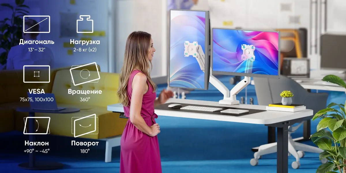 Устройство для крепления телевизоров либо компьютеров ONKRON G160 подходит для закрепления двух аппаратов одновременно благодаря своей универсальности. Оно поддерживает параметры VESA 75x75 и 100x100 мм, а также обладает функцией регулировки высоты (газпатрон) так, чтобы экран находился прямо напротив Ваших глаз. Кроме того, оно оборудовано кабель-каналом для хранения всех шнуров внутри себя - это поможет поддерживать чистоту рабочего пространства. Конструкция изделия допускает вращение на все 360 градусов вокруг своей оси для выбора наилучшего положения дисплея перед пользователем.