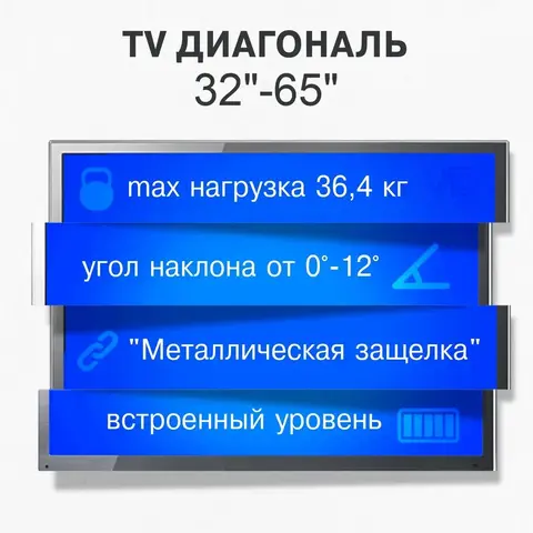 Кронштейн для телевизора – это удобное и надежное крепление, которое позволит наслаждаться просмотром, не загромождая пространство комнаты. Наш кронштейн подходит для телевизоров с диагональю от 32 до 65 дюймов, что делает его универсальным для большинства моделей.
