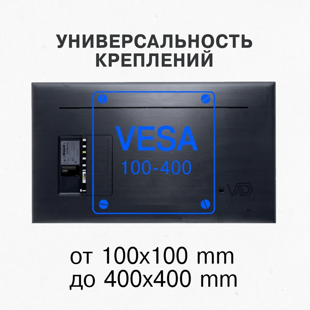 *Стандарт VESA – это расстояние (в мм) между точками крепления экрана к кронштейну. Кронштейны, которые появляются в списке рекомендуемых товаров, как правило, точно подходят к именно этой модели, но на всякий случай лучше свериться: стандарты VESA должны совпадать у устройства и у кронштейна. Узнать VESA можно самостоятельно: нужно линейкой/рулеткой измерить расстояние между двумя крепёжными отверстиями по горизонтали (это будет первое число) и двумя отверстиями по вертикали (второе число).