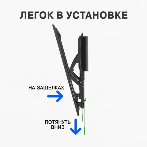 Когда нужно снять телевизор или подключить дополнительные провода, достаточно потянуть за зелёные фиксаторы, чтобы отодвинуть или снять устройство.