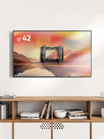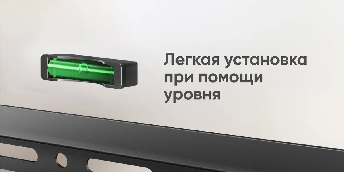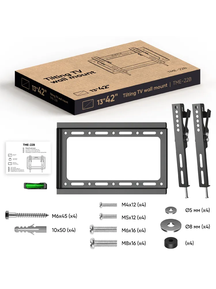 Кронштейн для телевизора, универсальный комплект крепежа для установки, направляющие к кронштейну, пузырьковый уровень, подробная инструкция на русском языке.