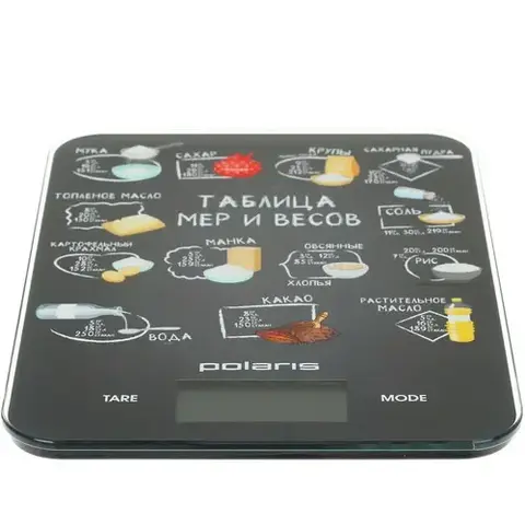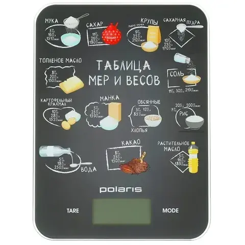 Кухонные весы Polaris PKS 1053DG Chalk − это очень полезное приобретение для кухни, с которым вы сможете готовить, следуя строго рецептуре. Креативное оформление прибора с информативным наполнением является дополнительным преимуществом: вы получаете таблицу мер и весов, выполненную в виде рисунка. Электронные весы представлены в виде платформы, изготовленной из сверхпрочного стекла. Основанием для них служит надежный пластик: на основании имеются четыре прорезиненные ножки, которые обеспечивают максимальную устойчивость прибора. Polaris PKS 1053DG Chalk поддерживают предел взвешивания 10 кг, что позволяет использовать весы и для подготовки фруктов, овощей, ягод для дальнейшей консервации. Погрешность 1 г при таком пределе является незначительной, поэтому весы можно назвать сверхточными. Особенность модели состоит в поддержке измерения объема жидкости, что позволит отмерять максимально точно каждый ингредиент. Функция "Тарокомпенсация" поможет получать чистый вес продуктов, используя при взвешивании емкость.