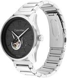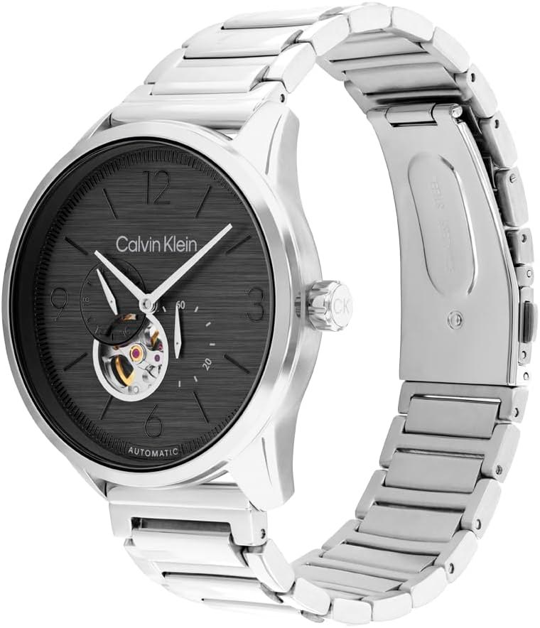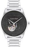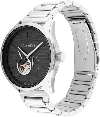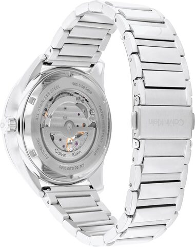 Часы поддерживают 12-часовой и 24-часовой форматы времени. Секундная стрелка вынесена на отдельный циферблат, а через прозрачное окошко на основном циферблате можно наблюдать за механизмом. Задняя крышка часов прозрачная и завинчивающаяся, а заводная головка рифленая и также украшена логотипом Calvin Klein.