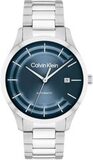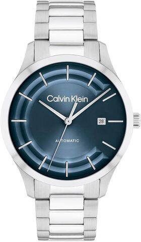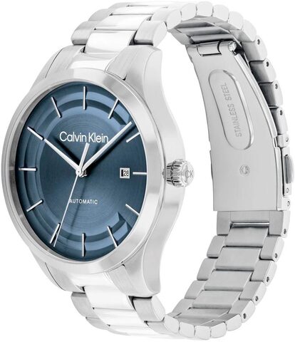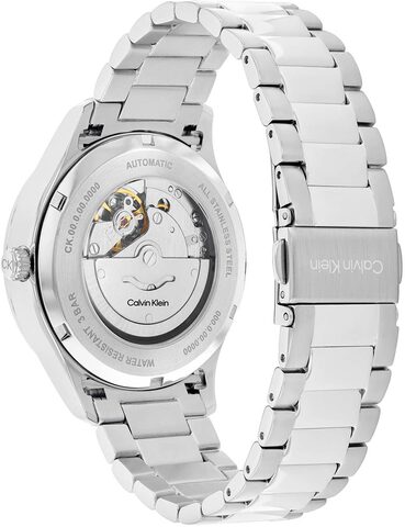 Дата отображается в положении 3 часов. Прозрачная задняя крышка закрывается на завинчивающуюся резьбу. Рифленая заводная головка также украшена логотипом бренда. Браслет изготовлен из стали и имеет как матовую, так и полированную отделку. Застежка раскладной конструкции оснащена двумя кнопками и логотипом Calvin Klein.