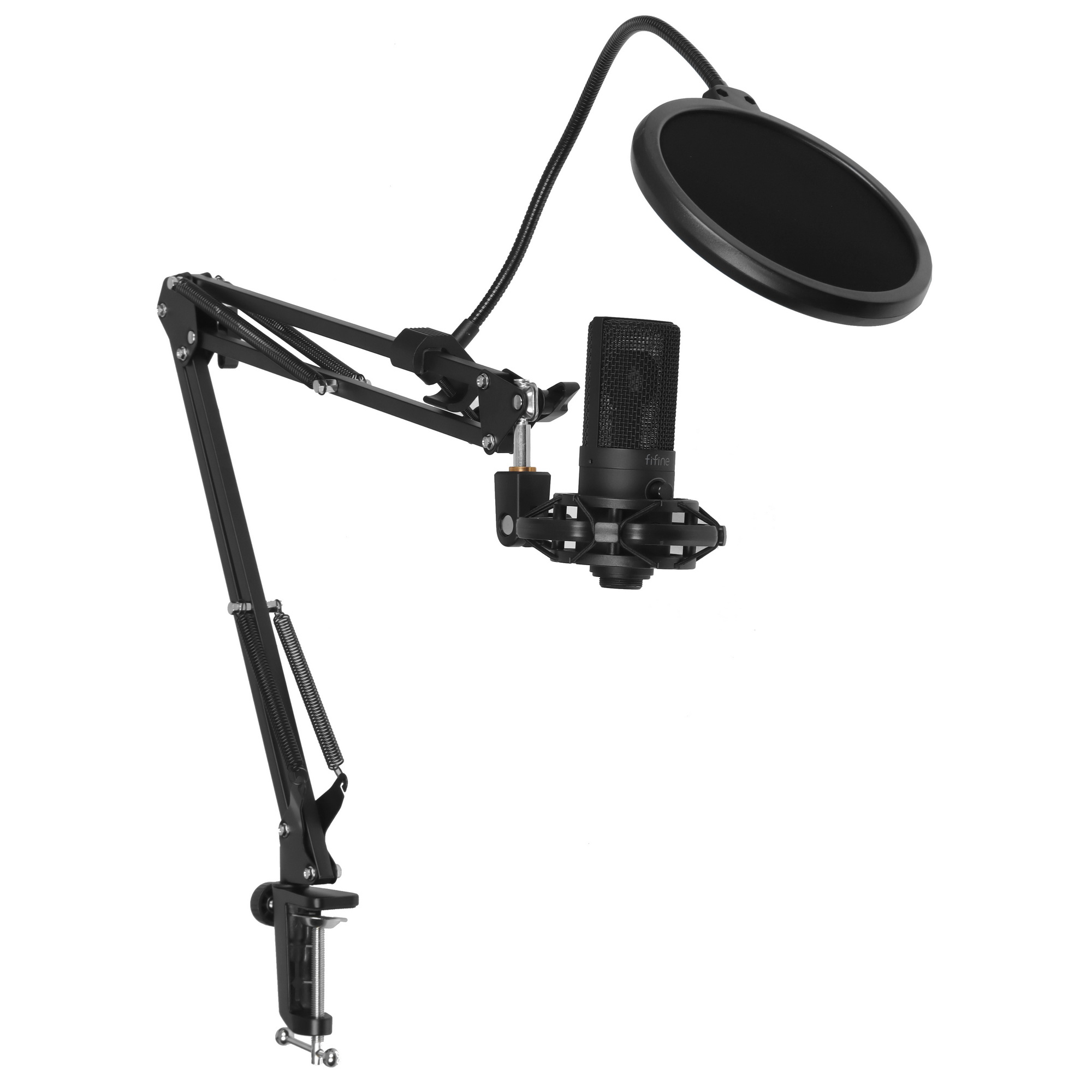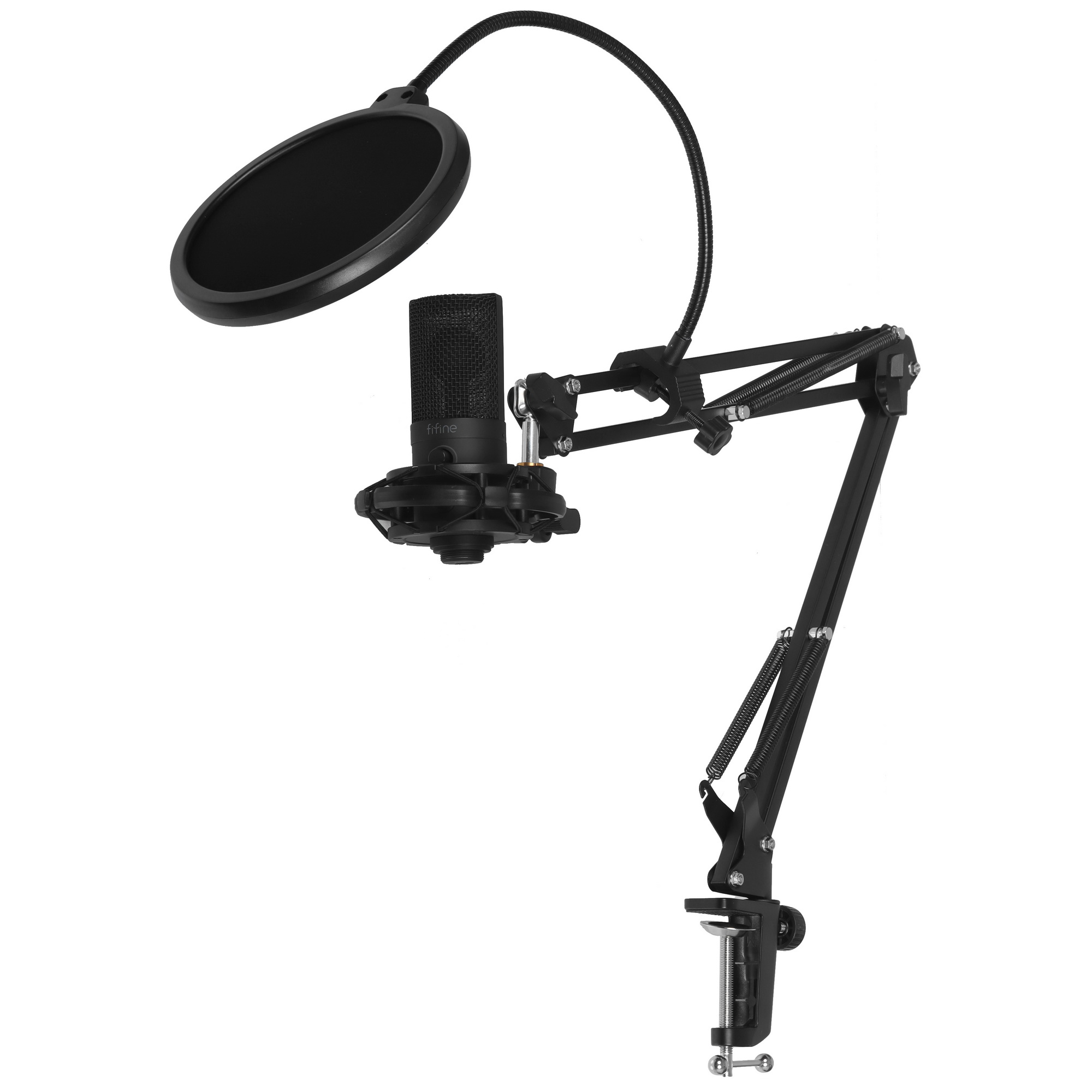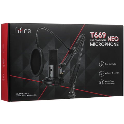 Fifine T669 NEO представляет собой комплект для записи, в который входят конденсаторный микрофон с кардиоидной направленностью, поп-фильтр, пантограф и крепление.