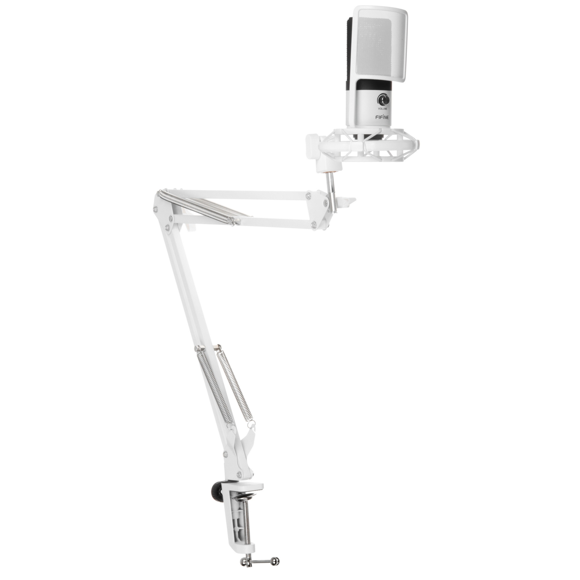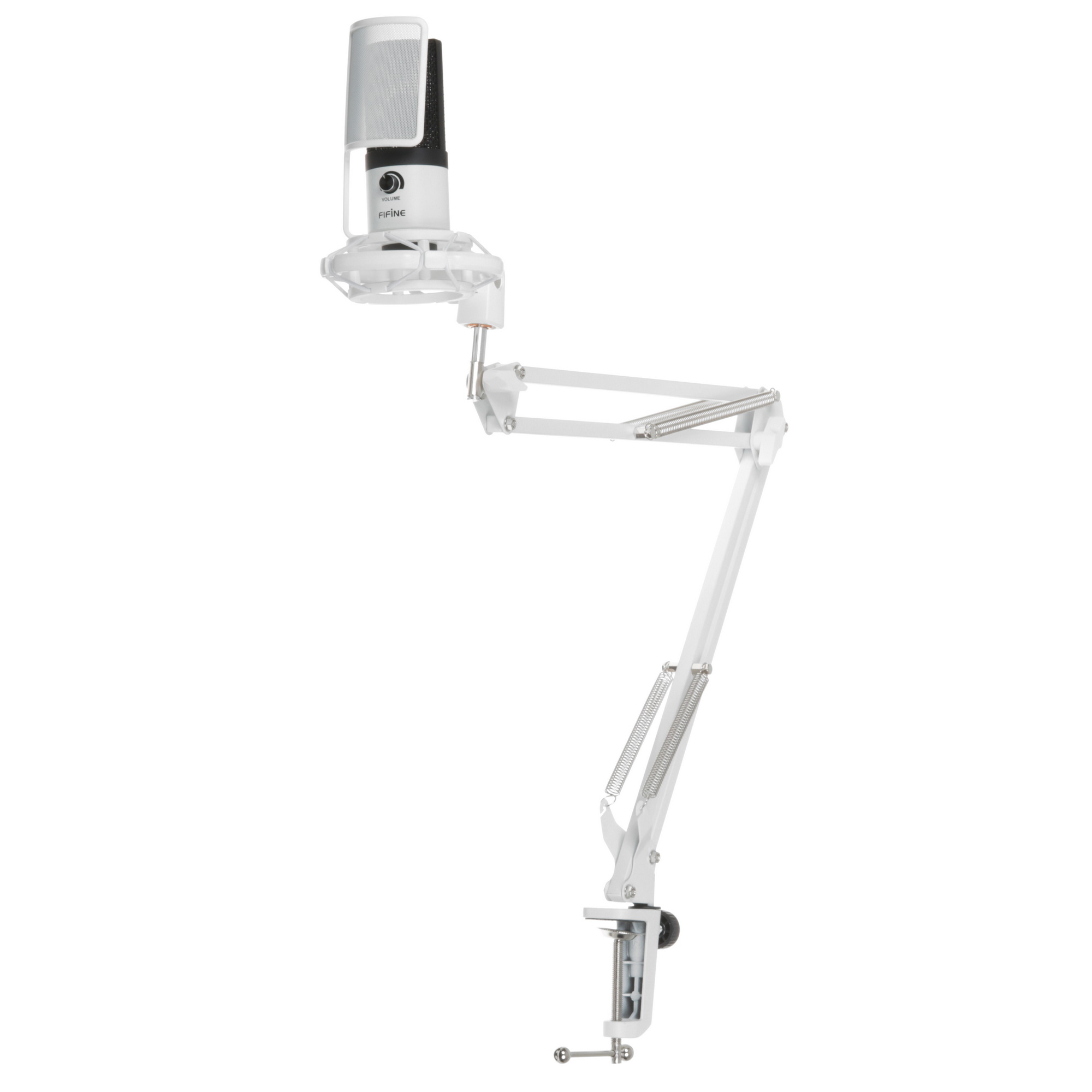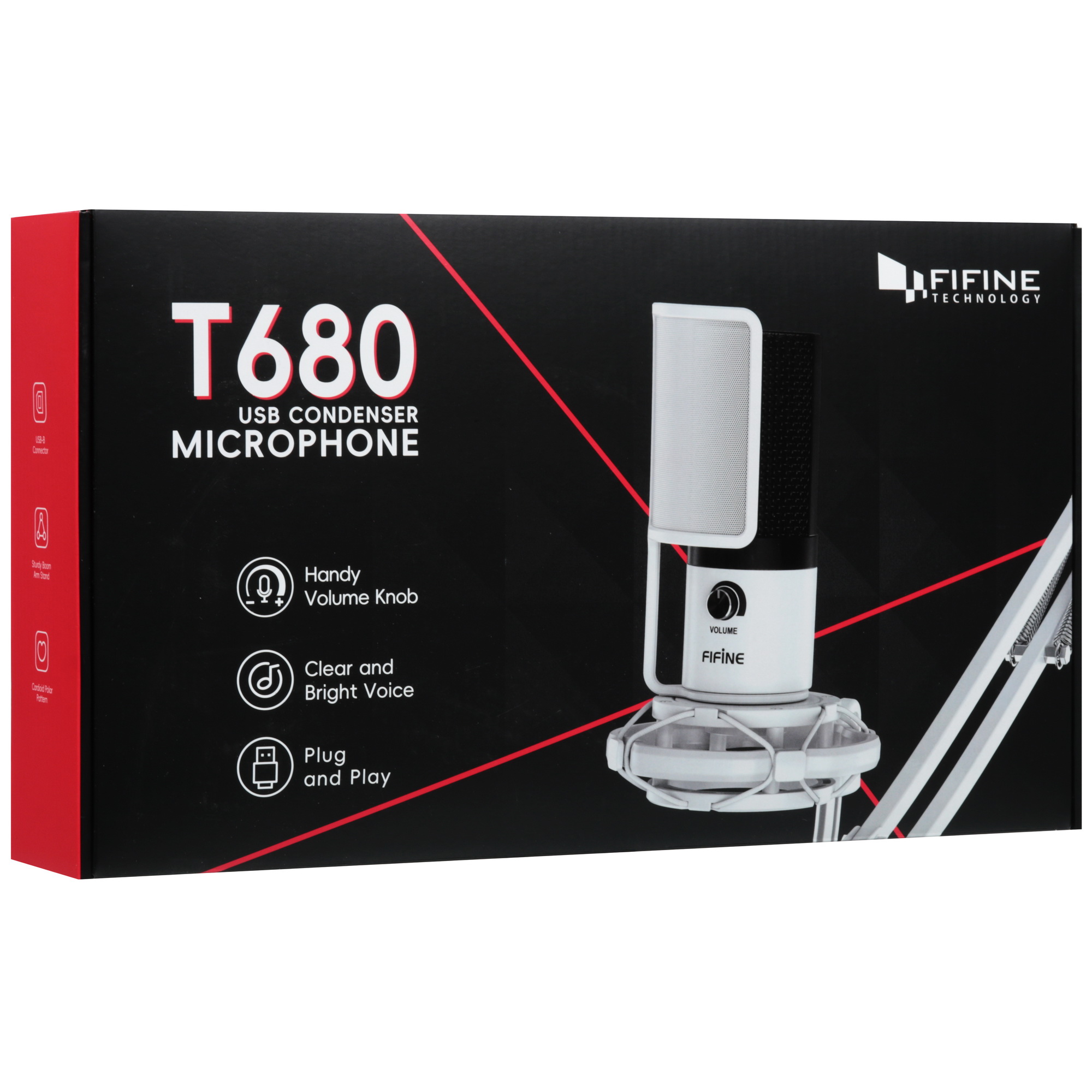 Микрофонный комплект Fifine T680W включает в себя конденсаторный микрофон с кардиоидной направленностью, поп-фильтр, настольную стойку, пантограф и съемный кабель питания длиной 2 метра. Все компоненты рассчитаны на использование на столе. Микрофон охватывает частотный диапазон от 20 Гц до 20000 Гц. Пользователь может самостоятельно регулировать его чувствительность. Подключение осуществляется через интерфейс USB Type-A.