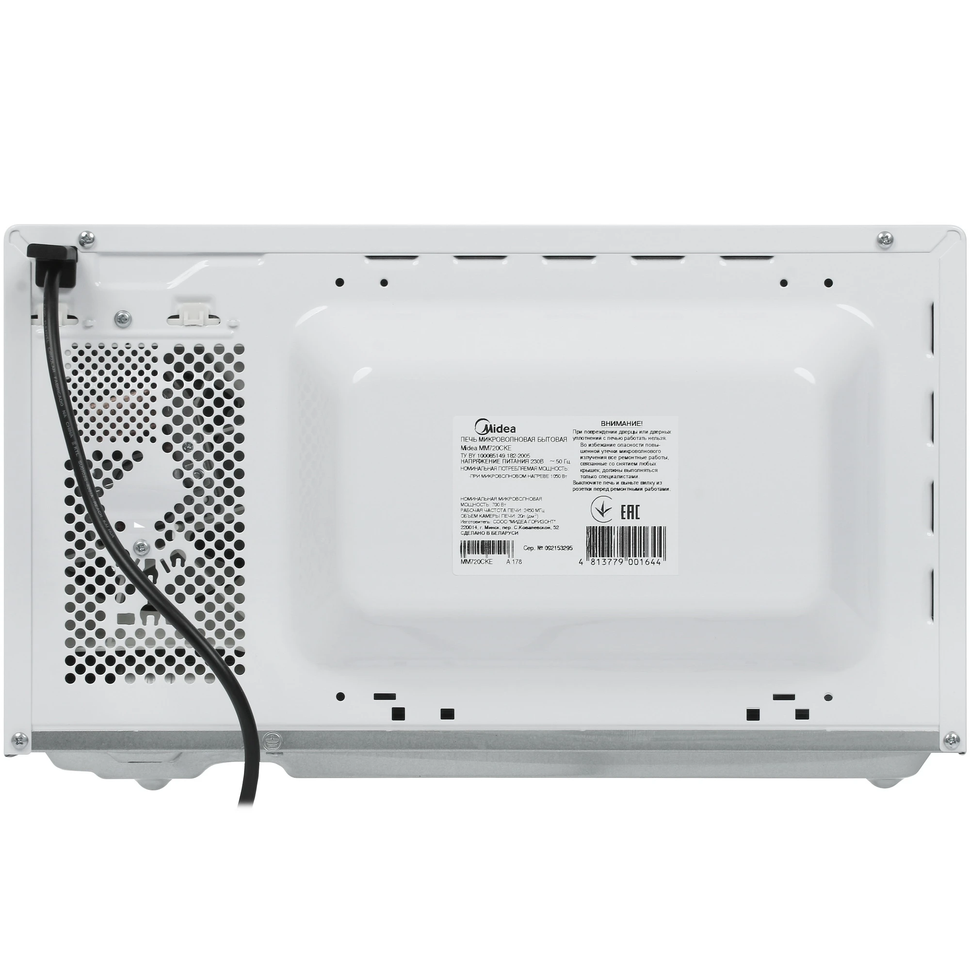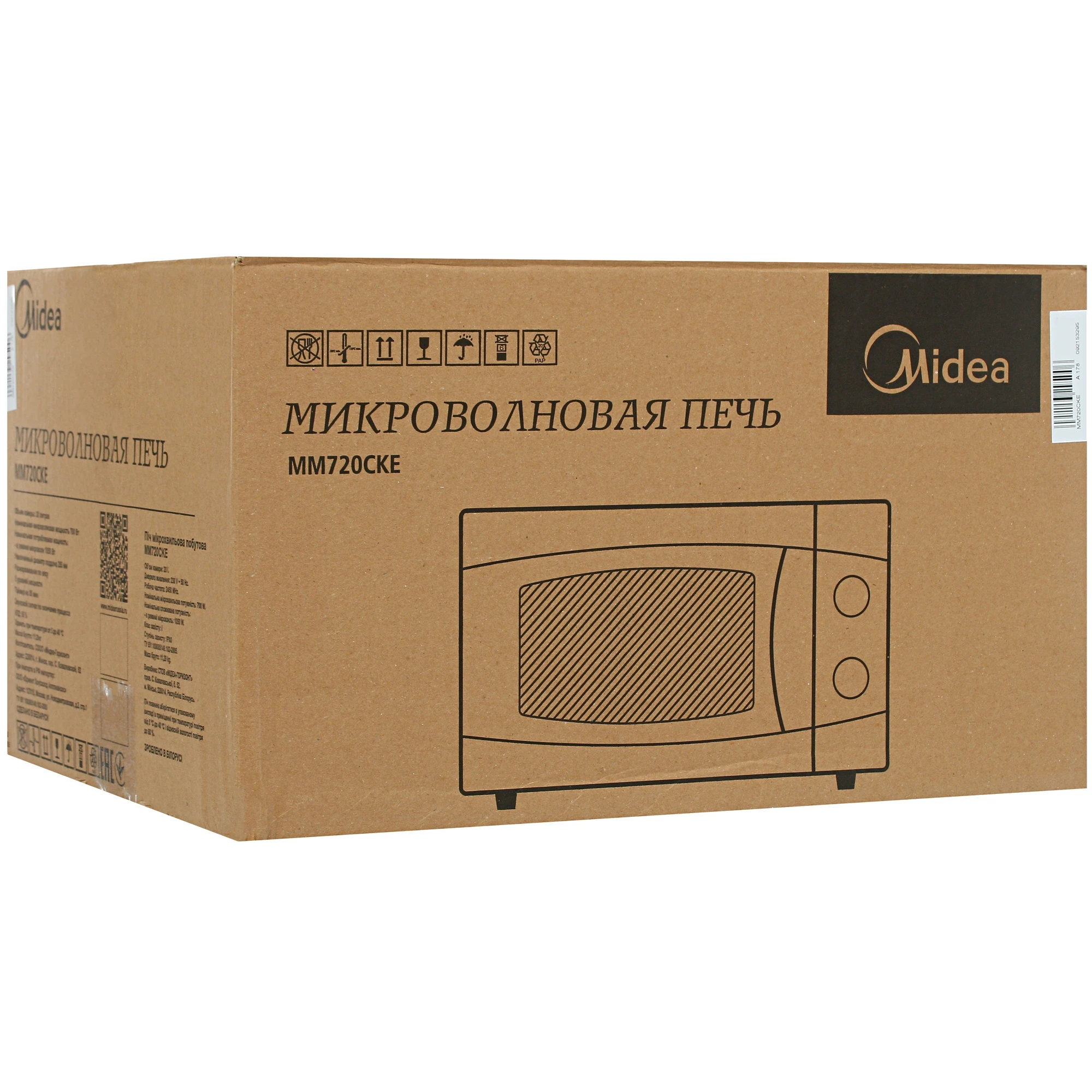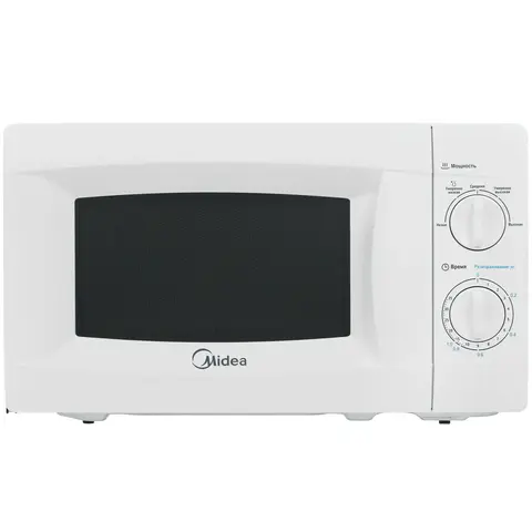 Микроволновая печь Midea MM720CKE выполнена в белом цвете. Её компактные размеры — 44x25,82x33 см — позволяют разместить прибор на ножках. Камера с вместимостью 20 литров покрыта эмалью, что упрощает уход за устройством.