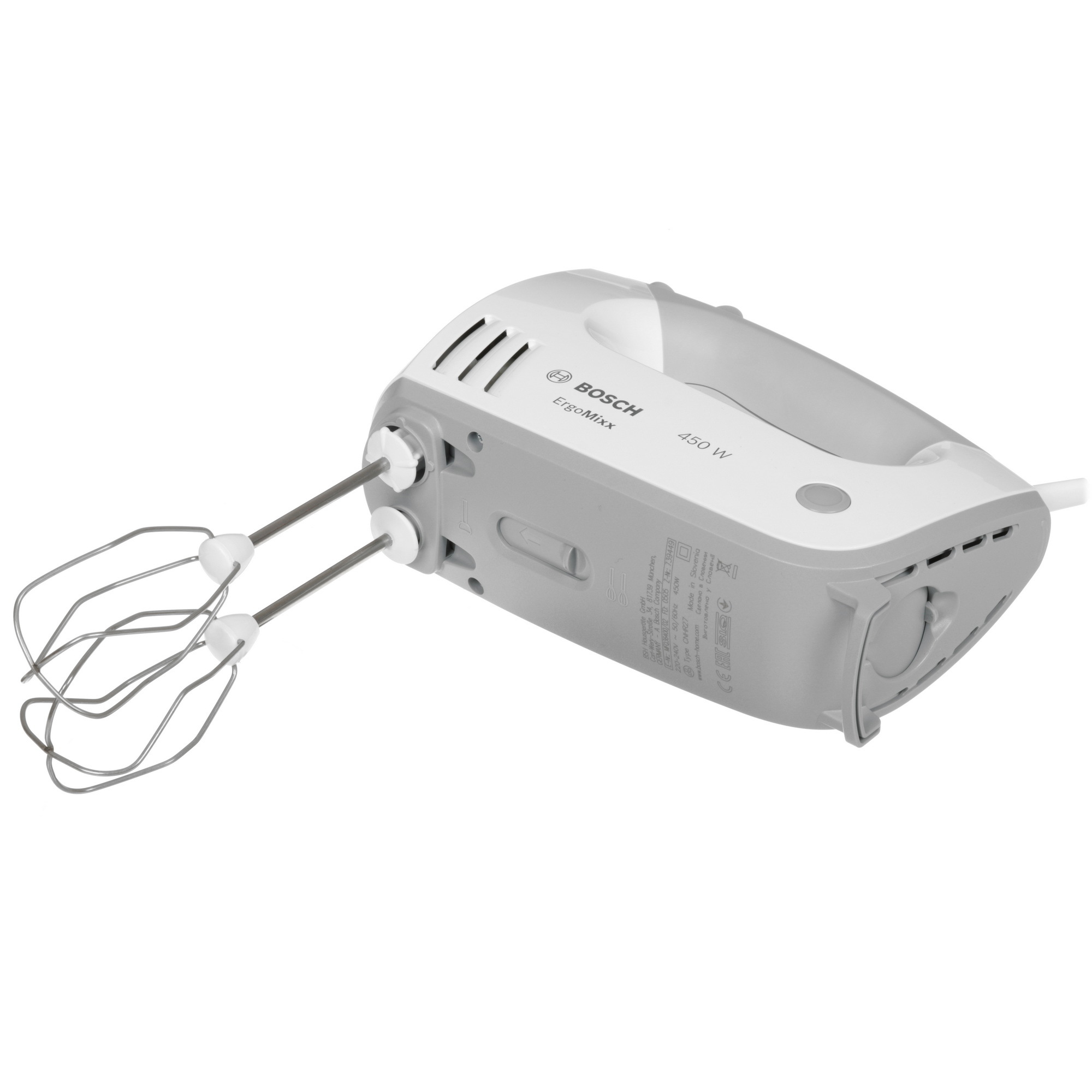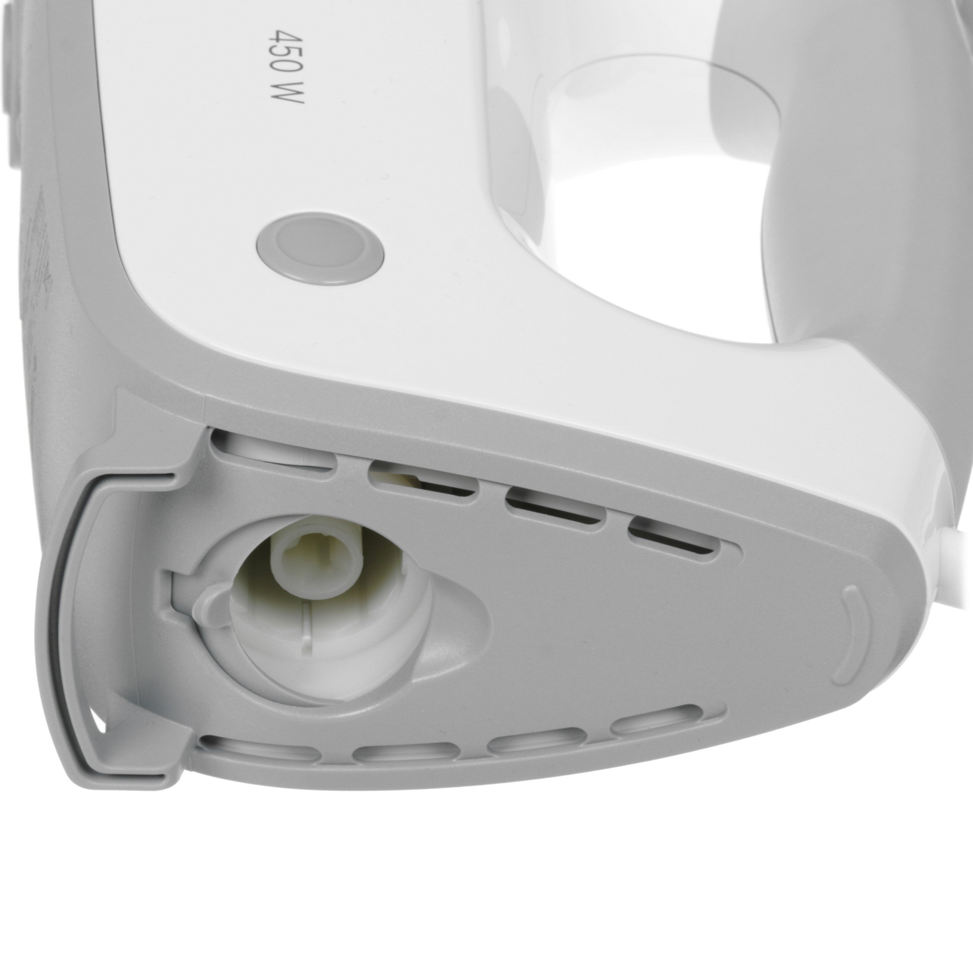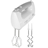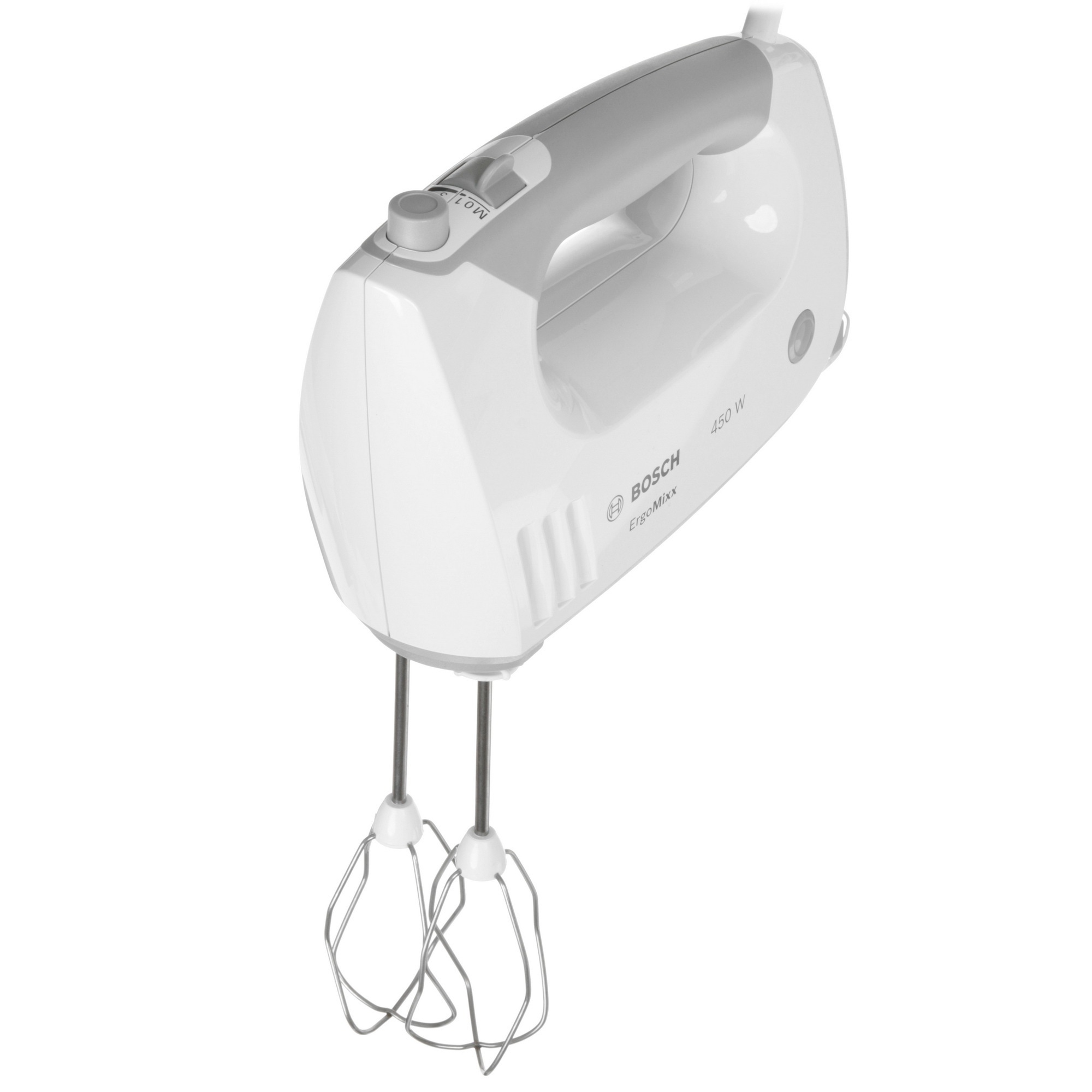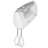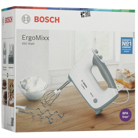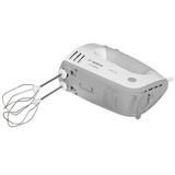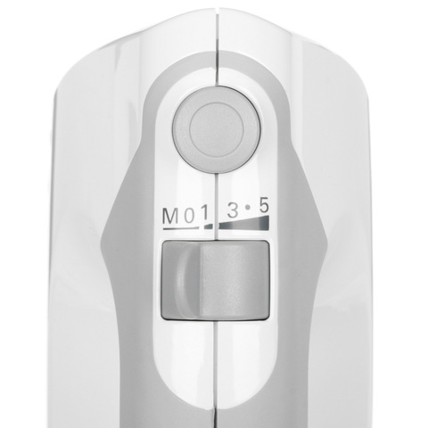 Выполнен в сочетании серого и белого цвета. Имеет 5 скоростей и дополнительный турборежим. В комплекте идут 4 насадки: 2 венчика для взбивания и 2 крючка для замешивания теста.