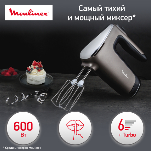 Лучшее сочетание: миксер Moulinex Powermix Silence показывает безупречную производительность и низкий уровень шума, что делает его самым тихим и самым мощным ручным миксером от Moulinex. Благодаря мотору мощностью 600 Вт, технологии оптимизации воздушного потока и передовой технологии шумоподавления, миксер легко и эффективно справляется с самыми сложными рецептами. Откройте для себя полный набор: ручной миксер с множеством удобных функций, надежные венчики и крюки для теста из нержавеющей стали и многое другое.