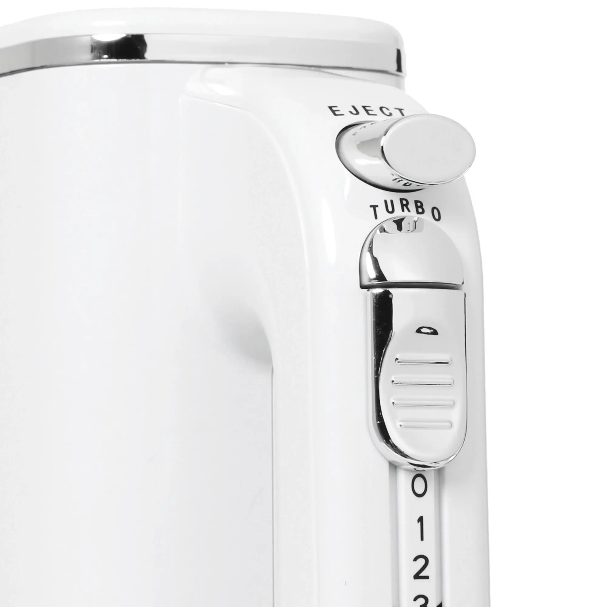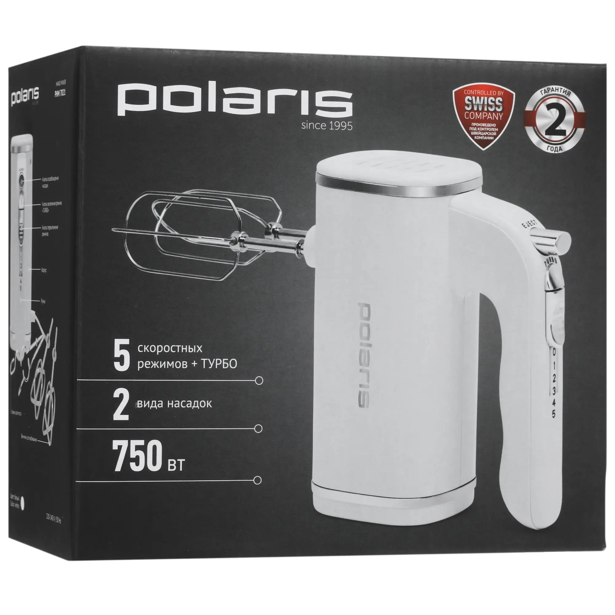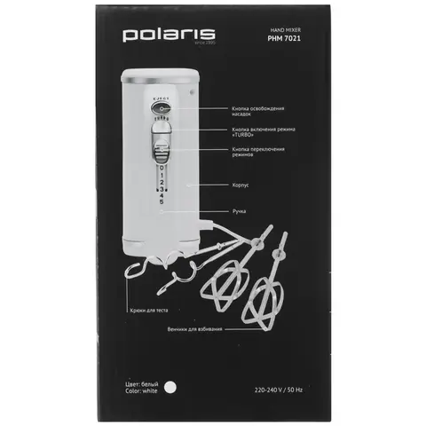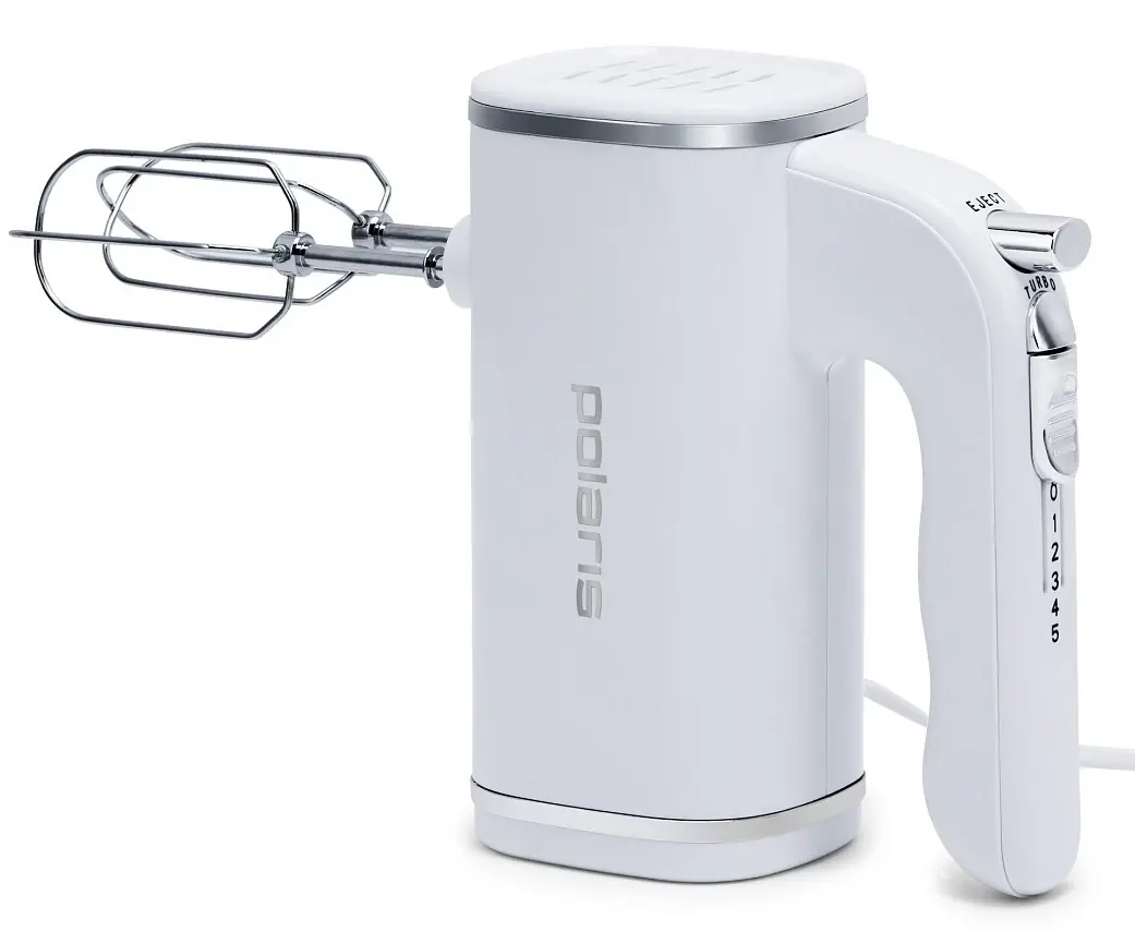 Миксер Polaris PHM 7021 выполнен в белом корпусе с удобной открытой ручкой эргономичной формы. Она повторяет очертание ладони, что обеспечивает надежный захват устройства и позволяет комфортно работать с продуктами. Модель мощностью 750 Вт работает в пяти скоростных режимах. Доступен также и турборежим. Для управления работой устройства используются кнопки и переключатель. Особая кнопка снимает защитную блокировку с насадок, позволяя легко их освободить.