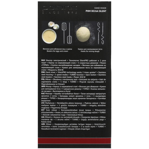 Миксер Polaris PHM 8026A Silent комплектуется 2 венчиками и 2 крюками для замешивания теста. При создании насадок использовалась нержавеющая сталь, которая не подвержена окислению в процессе взаимодействия с ингредиентами. Мощность 850 Вт позволяет прибору быстро взбивать и смешивать продукты.
