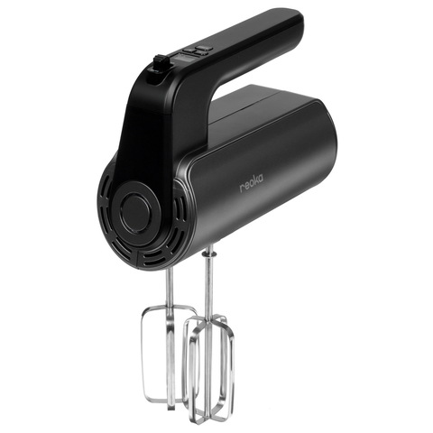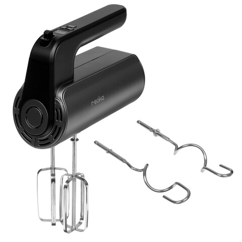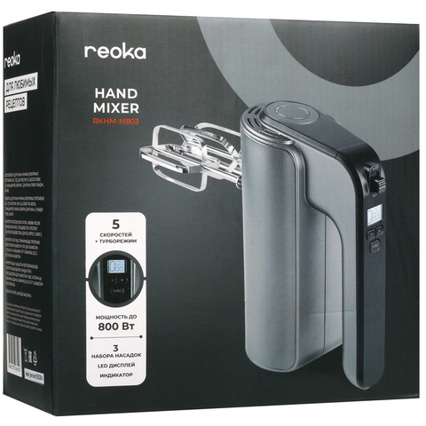Миксер Reoka RKHM-M803 с открытой ручкой выполнен в легком сером корпусе. На ручке находятся кнопки управления и дисплей. Он отображает скоростной режим и время работы прибора. Reoka RKHM-M803 обладает мощностью 800 Вт и поддерживает 5 скоростей. При активации турборежима миксер переходит на максимальную скорость, при которой создаются интенсивные вихри. В результате ингредиенты быстрее и лучше взбиваются. Устройство укомплектовано 6 насадками. Среди них 2 крюка для замешивания теста и 4 венчика с широкими и узкими лопастями. Для взбивания яичных белков подойдут венчики с тонкими прутиками, а для плотных кремов ‒ с толстыми.