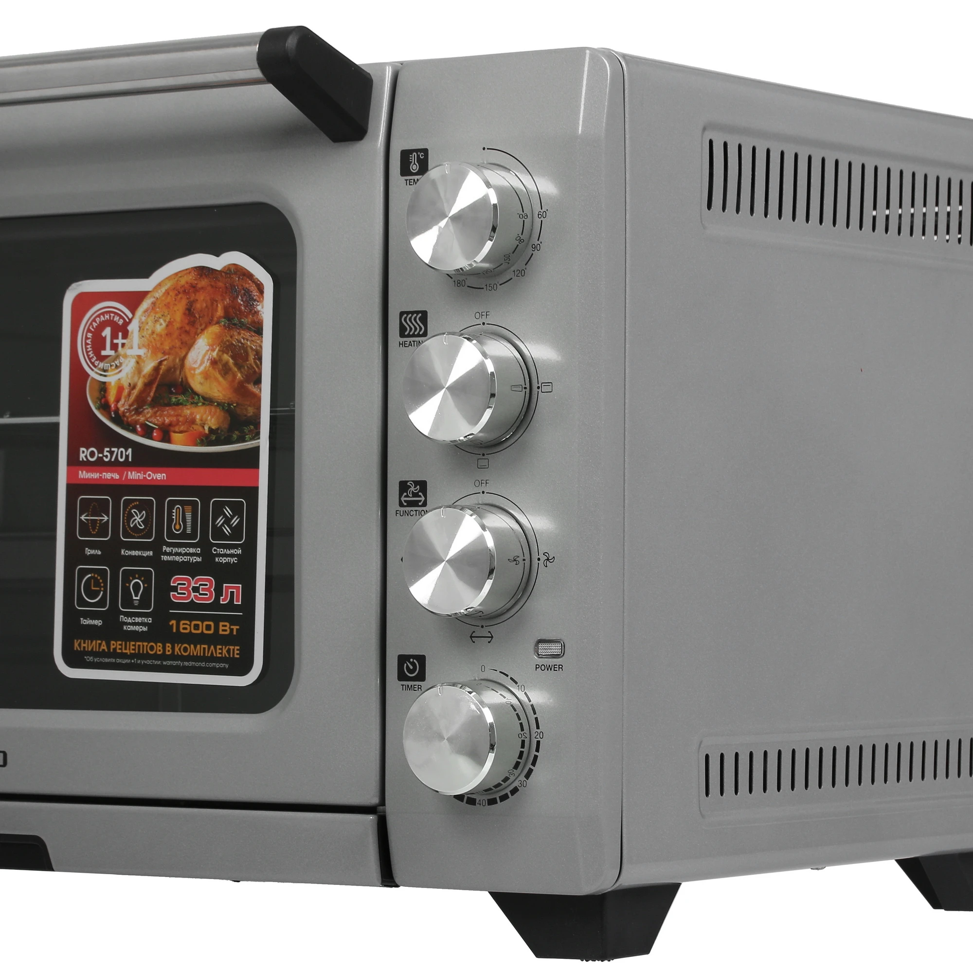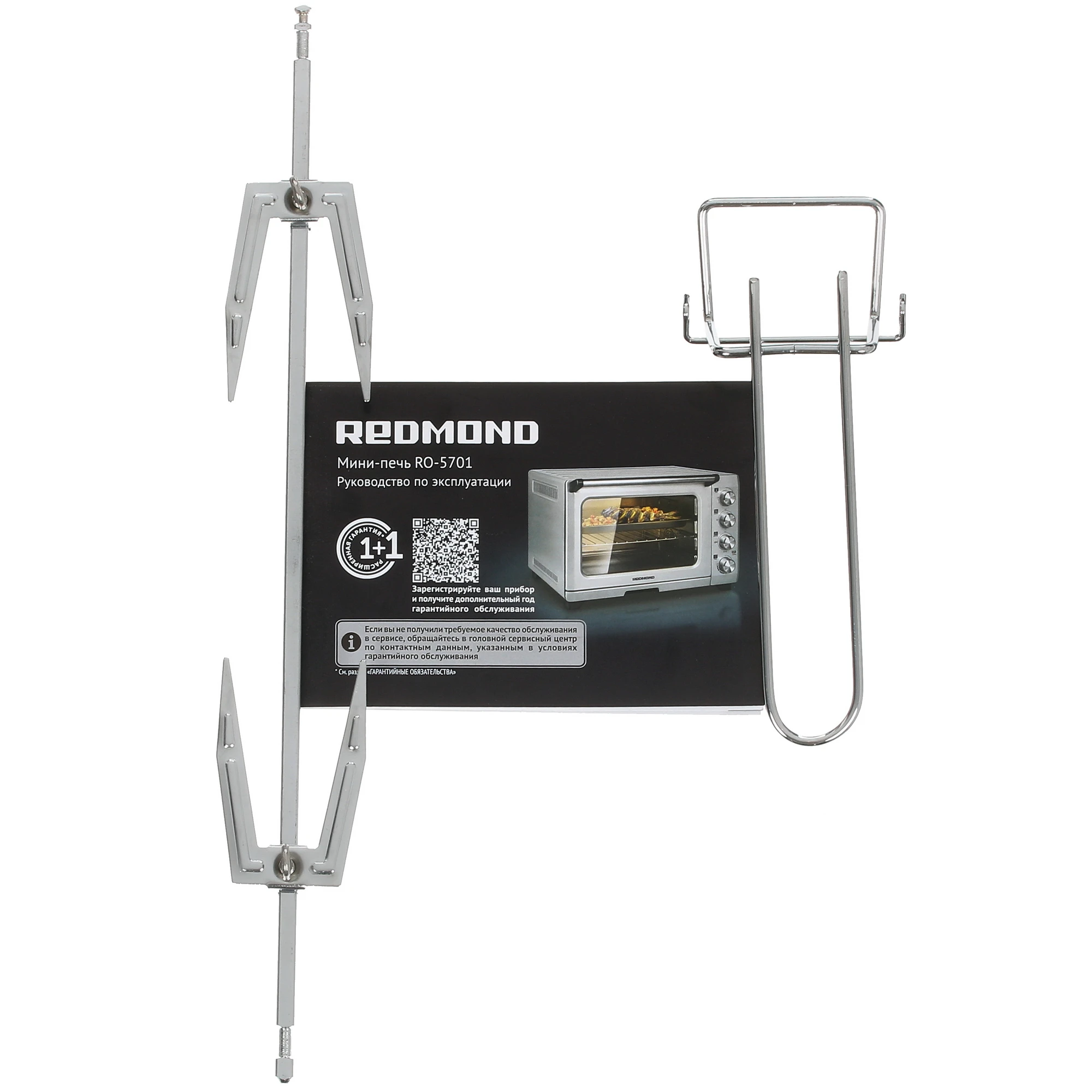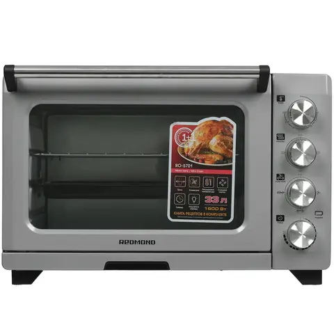 Мини-печь Redmond RO-5701 – это компактный прибор объемом 33 литра. В ней можно запекать курицу целиком или готовить цыпленка на вертеле. Она заменит полноценный духовой шкаф и подойдет даже для маленькой кухни.