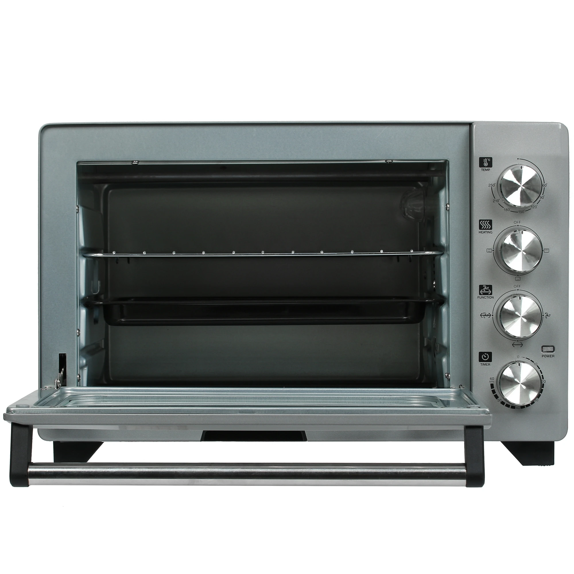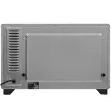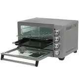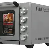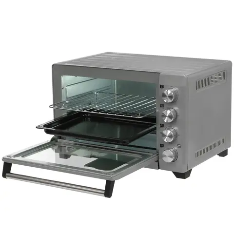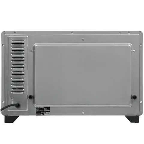 В конструкции печи есть вентилятор, который обеспечивает равномерное распределение горячего воздуха. Это ускоряет приготовление блюд и придает им золотистую корочку. Поворотные регуляторы позволяют установить температуру от 60 до 250 °C и задать время готовки до 60 минут. По истечении времени печь подаст звуковой сигнал.