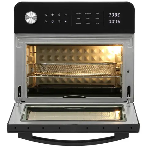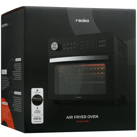 Мини-печь Reoka RKBM-M618 в элегантном черном цвете с устойчивыми ножками и вместительной камерой на 23 литра станет отличным выбором для небольших кухонь. Она позволяет готовить небольшими порциями, но при этом обладает широким функционалом. Среди девяти режимов работы есть программы для приготовления на вертеле, с использованием аэрогриля и активной конвекцией. Эта компактная печь заменяет духовой шкаф, печь для пиццы, шашлычницу и сушилку для овощей.