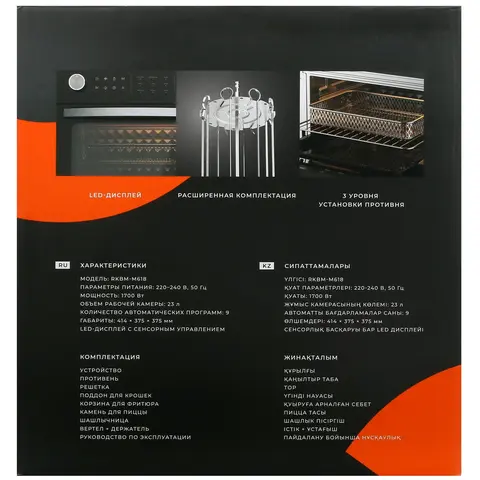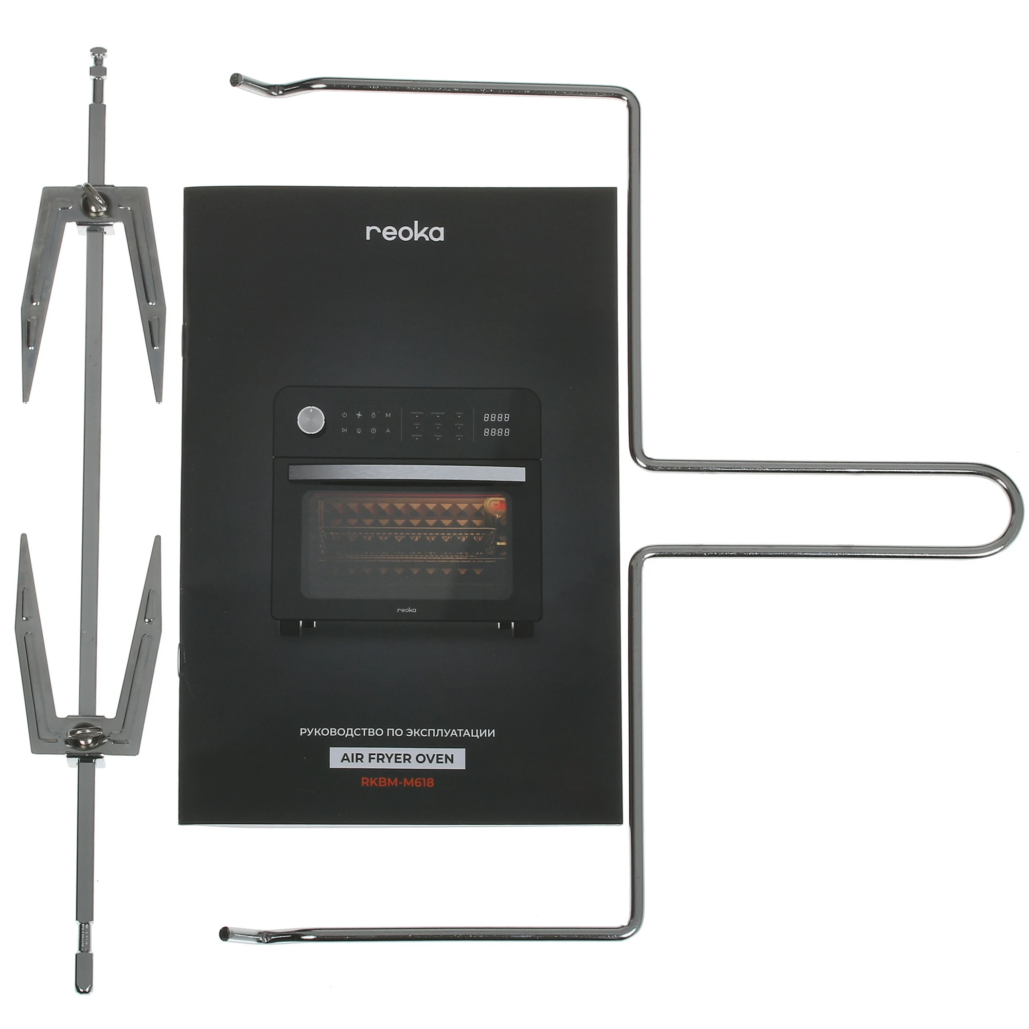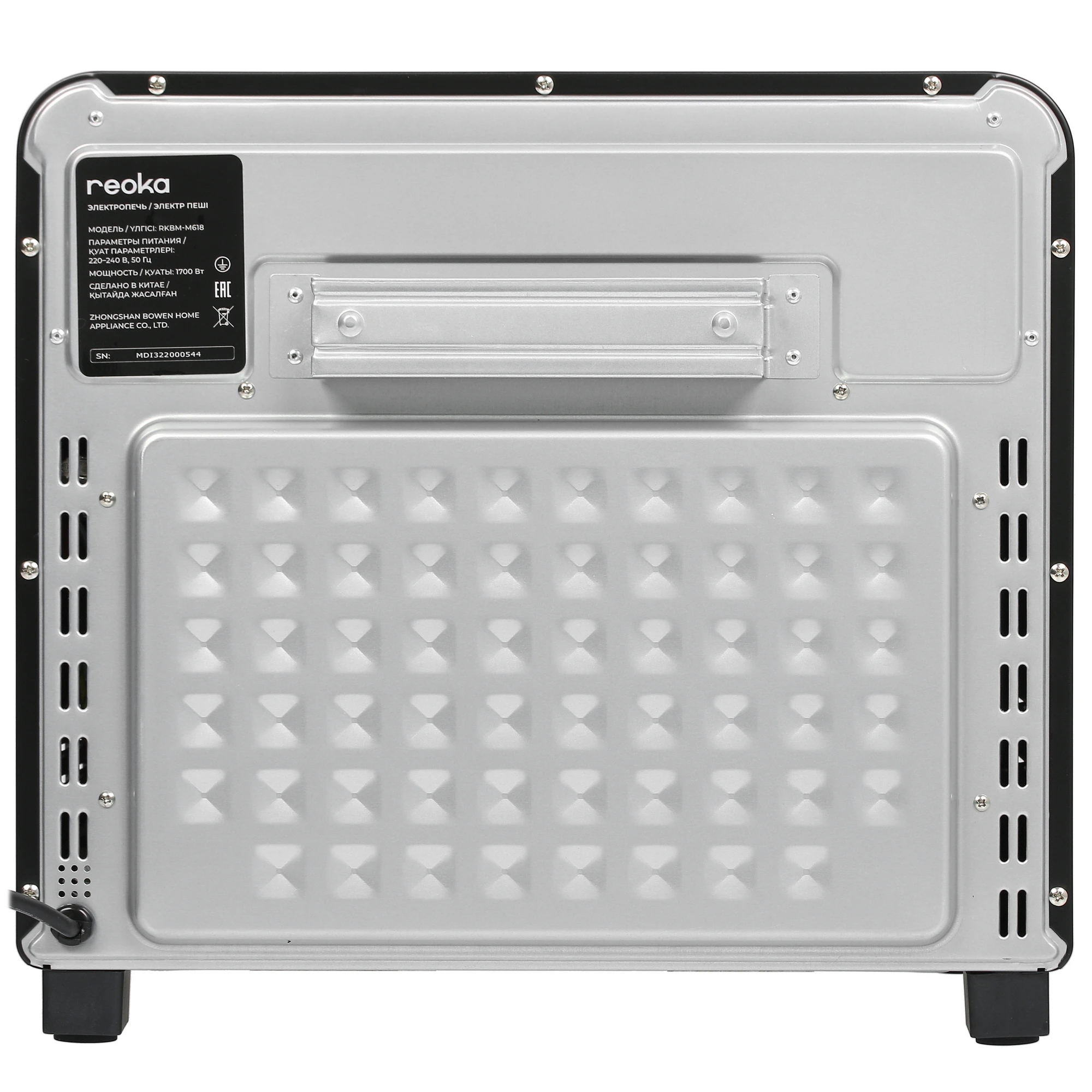 Reoka RKBM-M618 оснащена сенсорными кнопками с подсветкой и поворотным регулятором температуры. На дисплее отображаются активные функции, температура и таймер обратного отсчета, что делает управление интуитивно понятным. Яркая подсветка позволяет контролировать процесс готовки, не открывая дверцу, что особенно удобно.