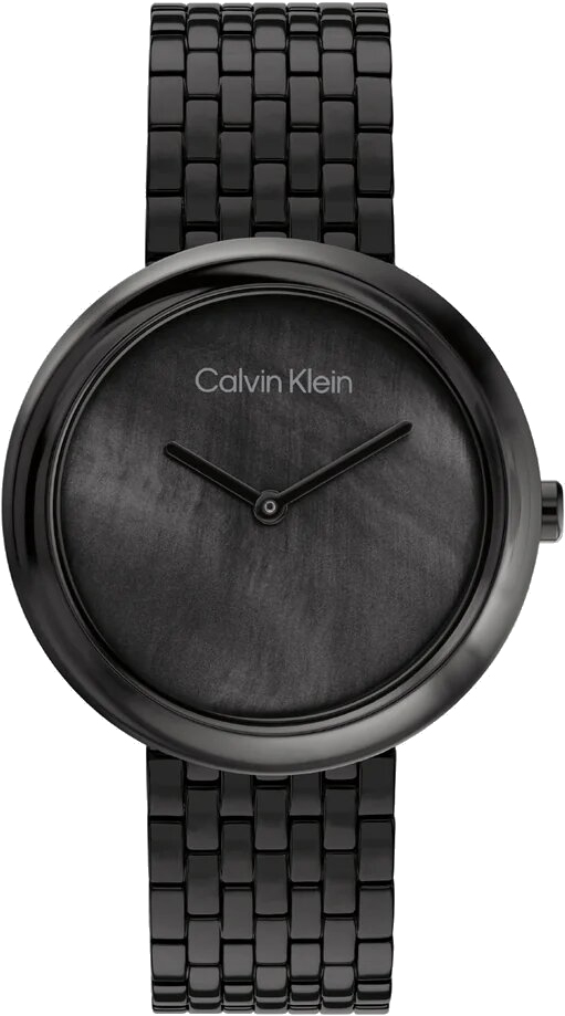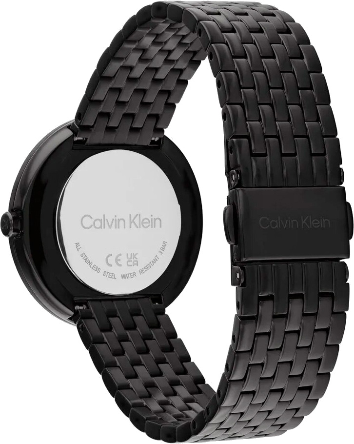 Элегантные часы, подчеркивающие уникальность и стиль своей обладательницы, придают её образу изысканность и завершенность. Это женские кварцевые часы. Корпус круглой формы выполнен из полированной нержавеющей стали с черным IP покрытием. Безель закручен. Перламутровый циферблат без отметок украшен фирменным логотипом Calvin Klein и защищен минеральным стеклом. Стрелки в стиле Baton имеют прямоугольную форму. Секундная стрелка отсутствует. Заводная головка декорирована логотипом CK. Надежный стальной браслет с черным IP покрытием и раскладывающейся застежкой, оснащенной двумя кнопками и логотипом Calvin Klein, завершает образ.